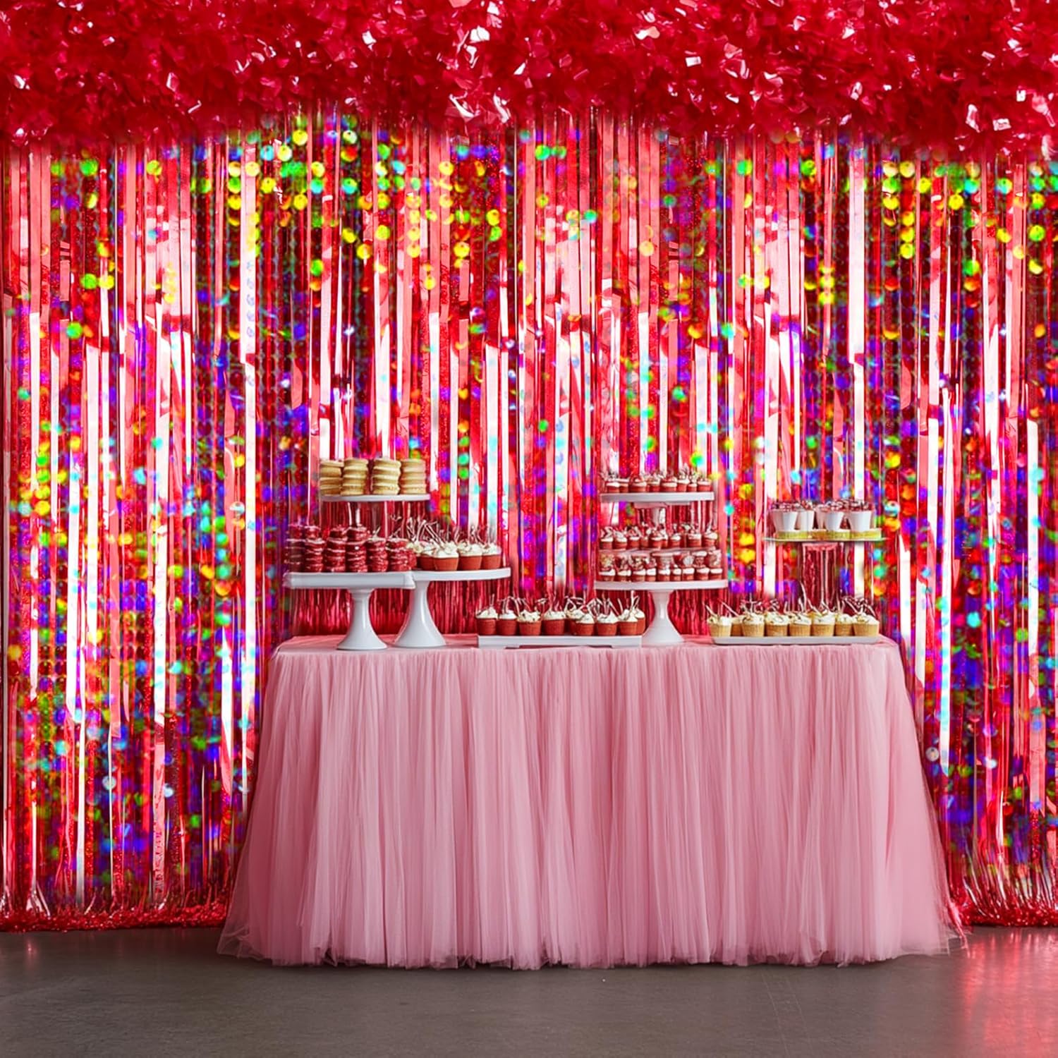 • Shiny Holographic Design: Different from usual red backdrop, our fringe backdrop features a shiny holographic design, and it shows different color effects under different light, reflecting light in shades of silver, blue, pink, purple, and teal, that creates an eye-catching and mesmerizing effect. Perfect for the doorway, window, wall, living room, dessert table backdrop, and stage background decorations.