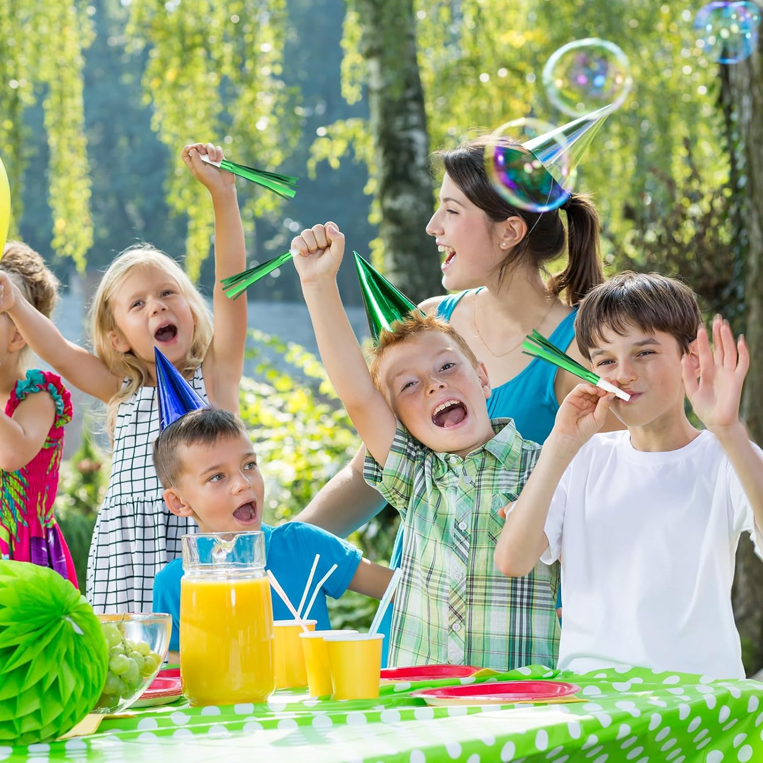 • Fun Party Favors: Set of 24 metallic fringed noise makers in green color, perfect for adding excitement and celebration to any party or event.
