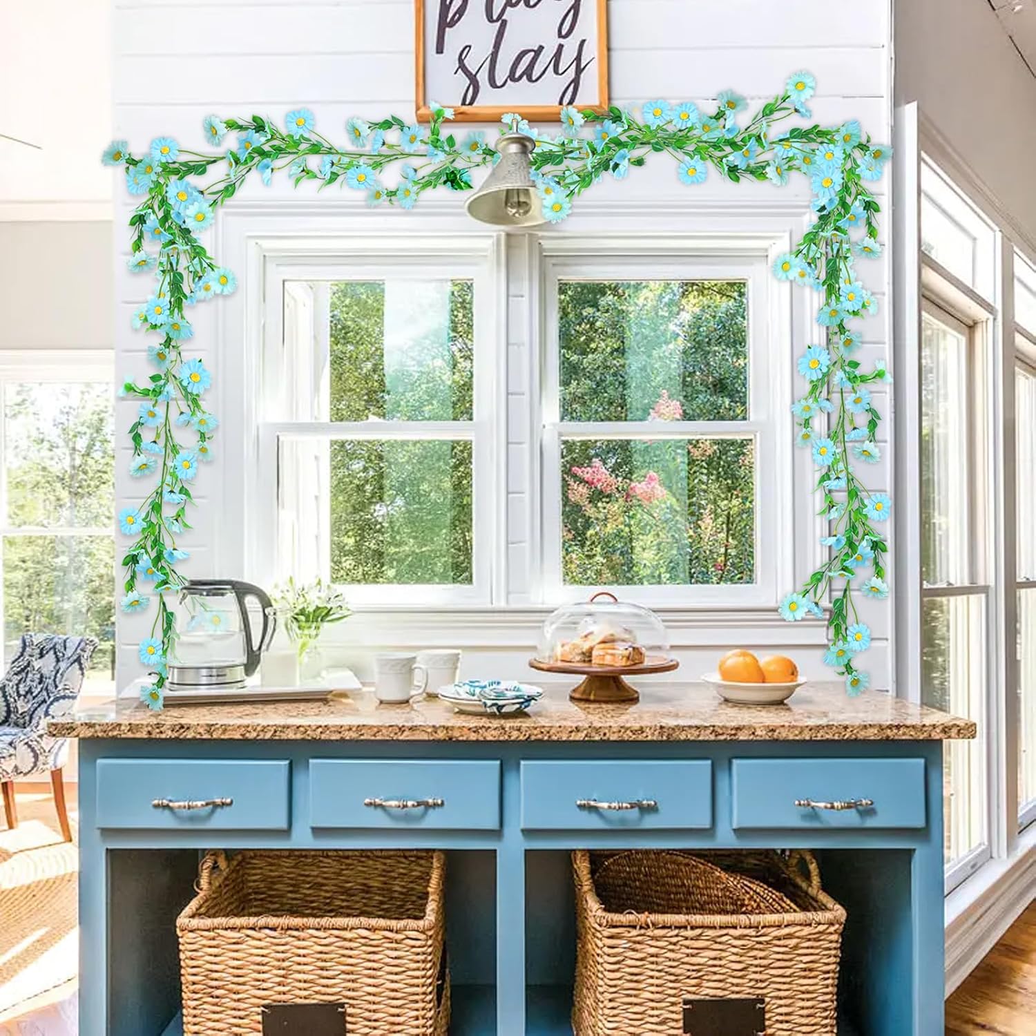 2 Pack Silk Flower Garland Artificial Blue Daisy Garland Fake Hanging Vines with Daisy Flowers for Wall Home Party Wedding Indoor Outdoor Spring Decor