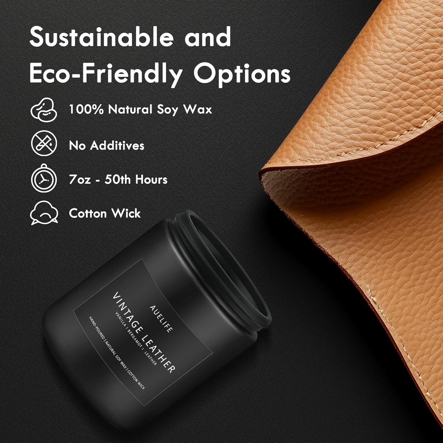 • Journey into Nostalgia and Elegance -- Leather's natural and multi-layered scent is a breath of fresh air. It’s grounding yet subtle, rugged yet refined, and always inviting. The leather scent in candles blends with notes of leather, bergamot, and hints of vanilla, creating a sense of nostalgia and timeless elegance.