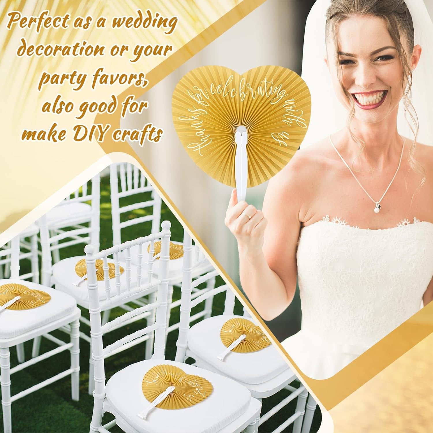 • Generous Pack of 120: our package includes 120 pieces of wedding gold folding fans, each elegantly printed with the heartwarming message 'Thanks for Celebrating with US' and comes with a gift bag; Wedding fans are suitable for distributing among guests at wedding parties, bridal showers, or summer parties, adding a sweet atmosphere to your special events