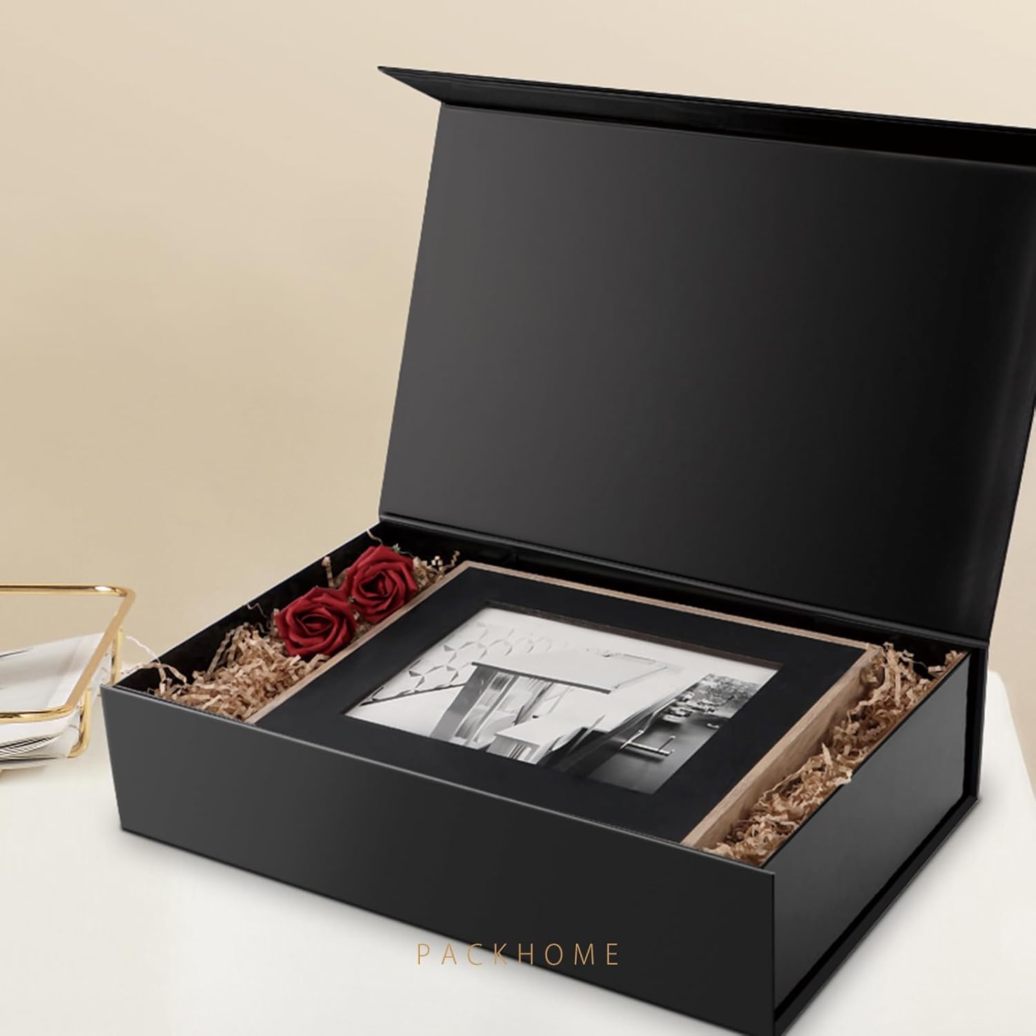• High Quality: The collapsible gift box is made from high-quality hardboard. Sturdy gift box with lid has a glossy black finish with neat flap. The tape used is from Tesa Germany