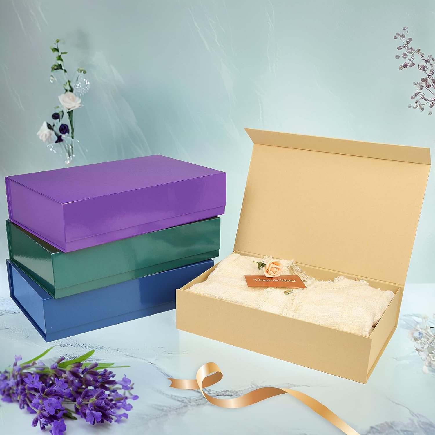 • High Quality: The collapsible gift box is made from high-quality hardboard. Sturdy gift box with lid has a glossy purple finish with neat flap. The tape used is from Tesa Germany