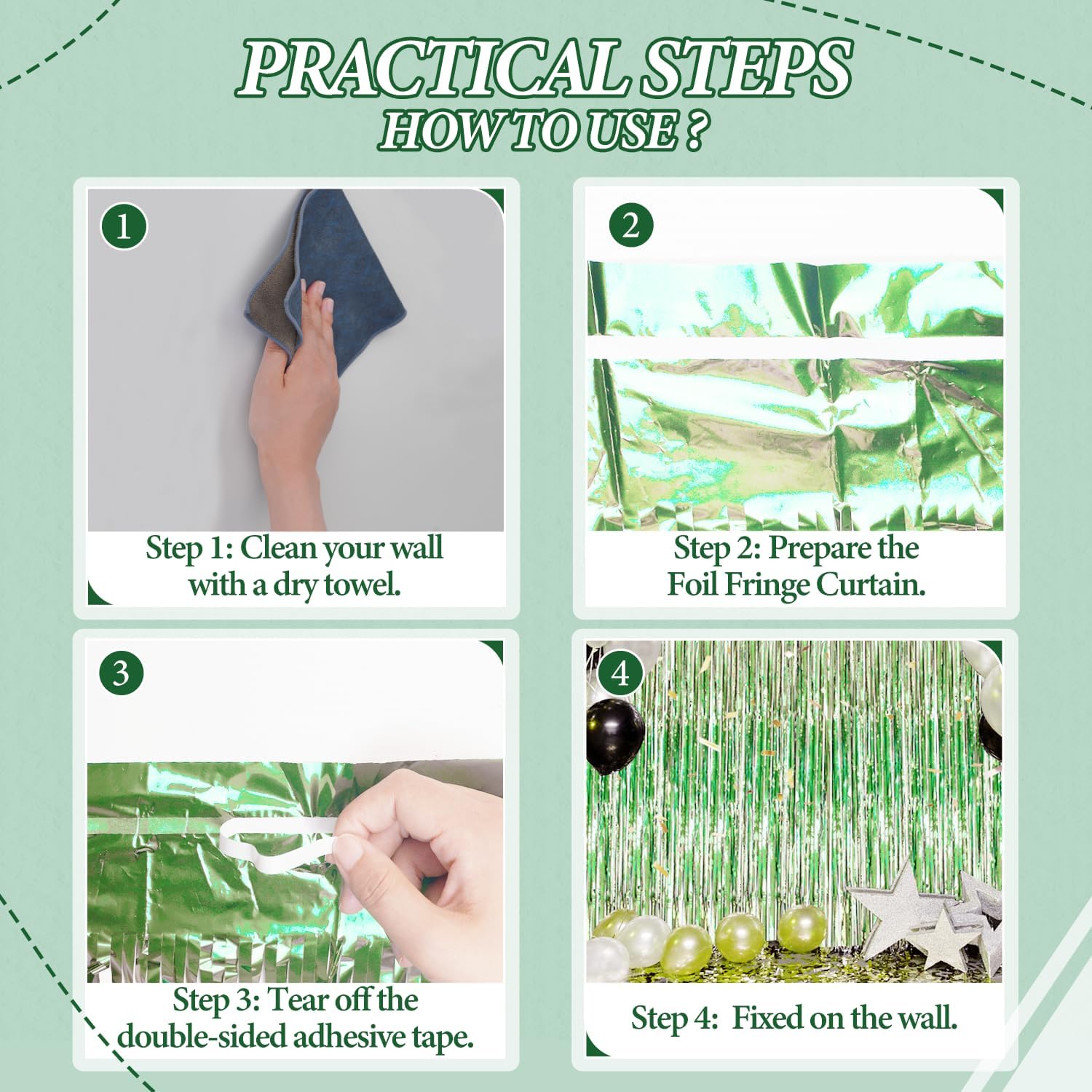 • 【Easy and Convenient Installation】These foil fringe curtains are easy to install and can be quickly hung on smooth surfaces using the included double-sided adhesive tape. No extra tools or materials required.