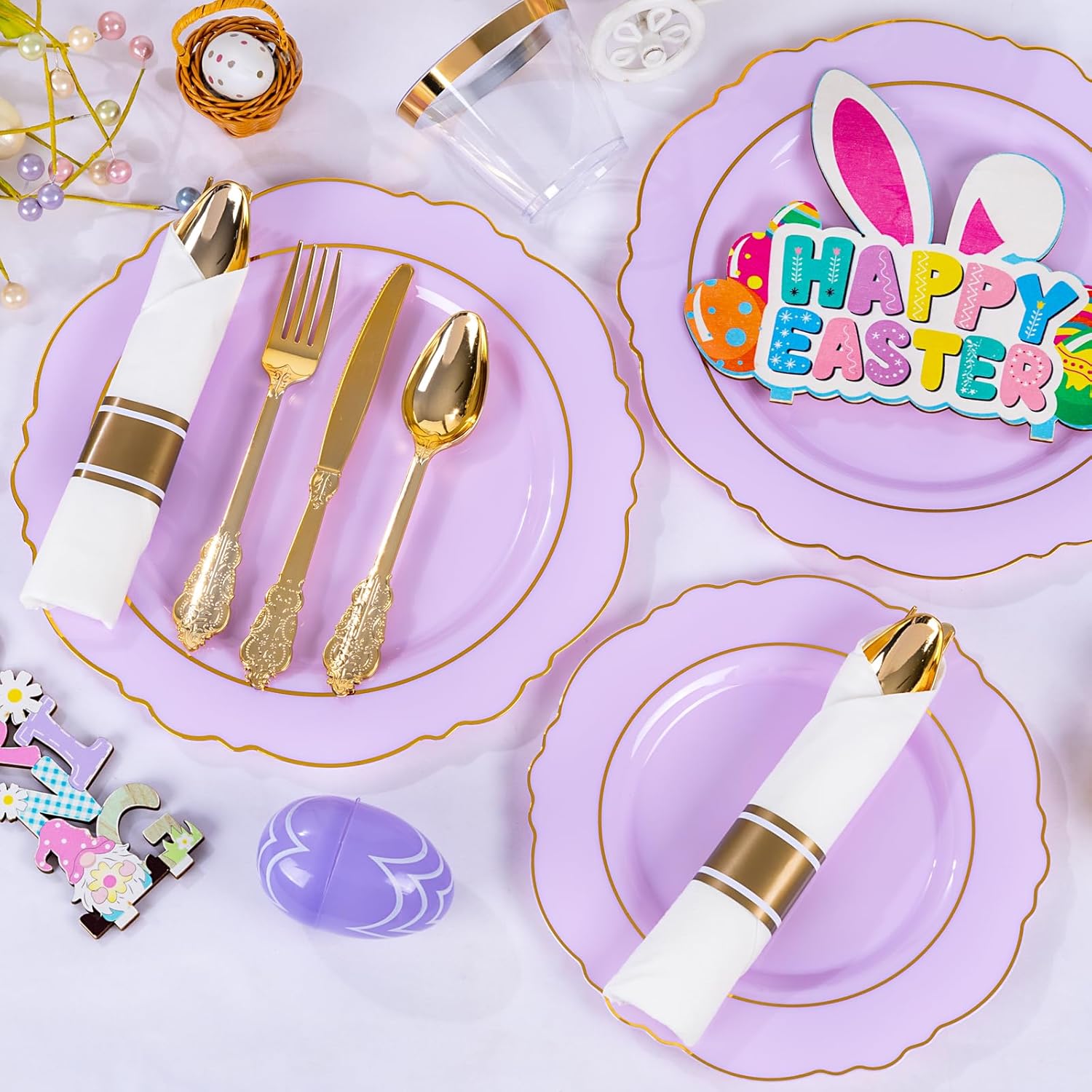 Liacere 350PCS Purple Plastic Plates - Disposable Light Purple and Gold Plates 50guest Baroque Plastic Dinnerware include 100Plates, 50Pack Pre Rolled Napkins with Silverware 50Cups for Mother's Day
