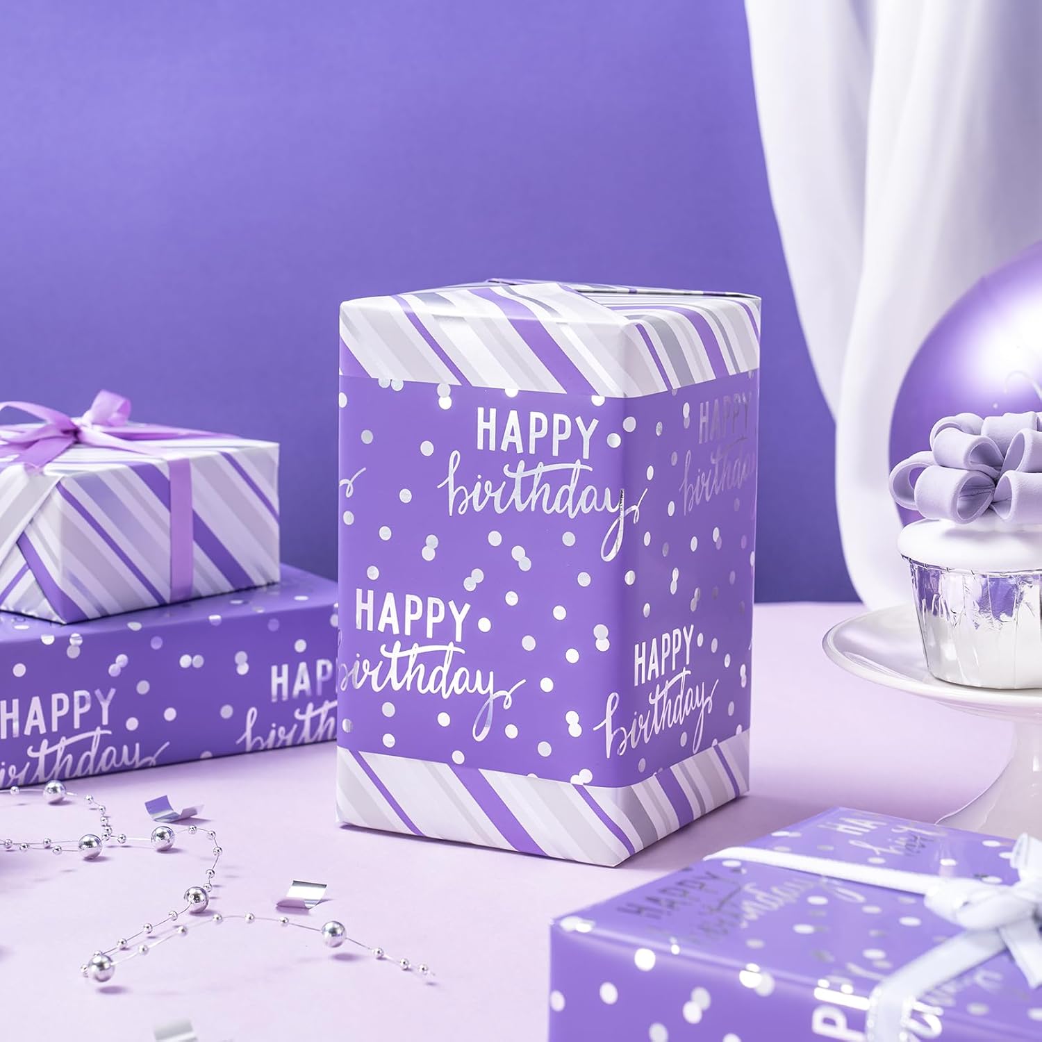 • HAPPY BIRTHDAY WRAPPING PAPER–This purple birthday wrapping paper features an elegant dual-sided design. One side showcases "Happy Birthday" in shiny silver foil with scattered metallic dots in purple, silver, and white. The reverse side presents a stylish striped pattern in coordinating shades of purple, silver, and white for a modern, sophisticated look.