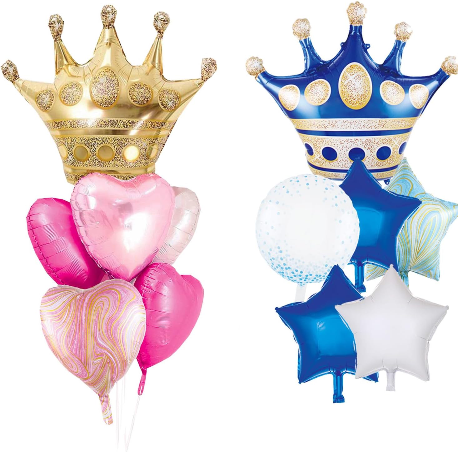 • Festive Balloons Set: This set includes 2 large crown balloons, 5 heart-shaped balloons (2 hot pink, 1 pink, 1 marbled pink and one white), 4 various star foil balloons and one blue dot clear foil balloon.Perfect for birthdays, gender reveal party decorations,boy or girl baby shower decor,pink and blue balloons party, or princess parties.