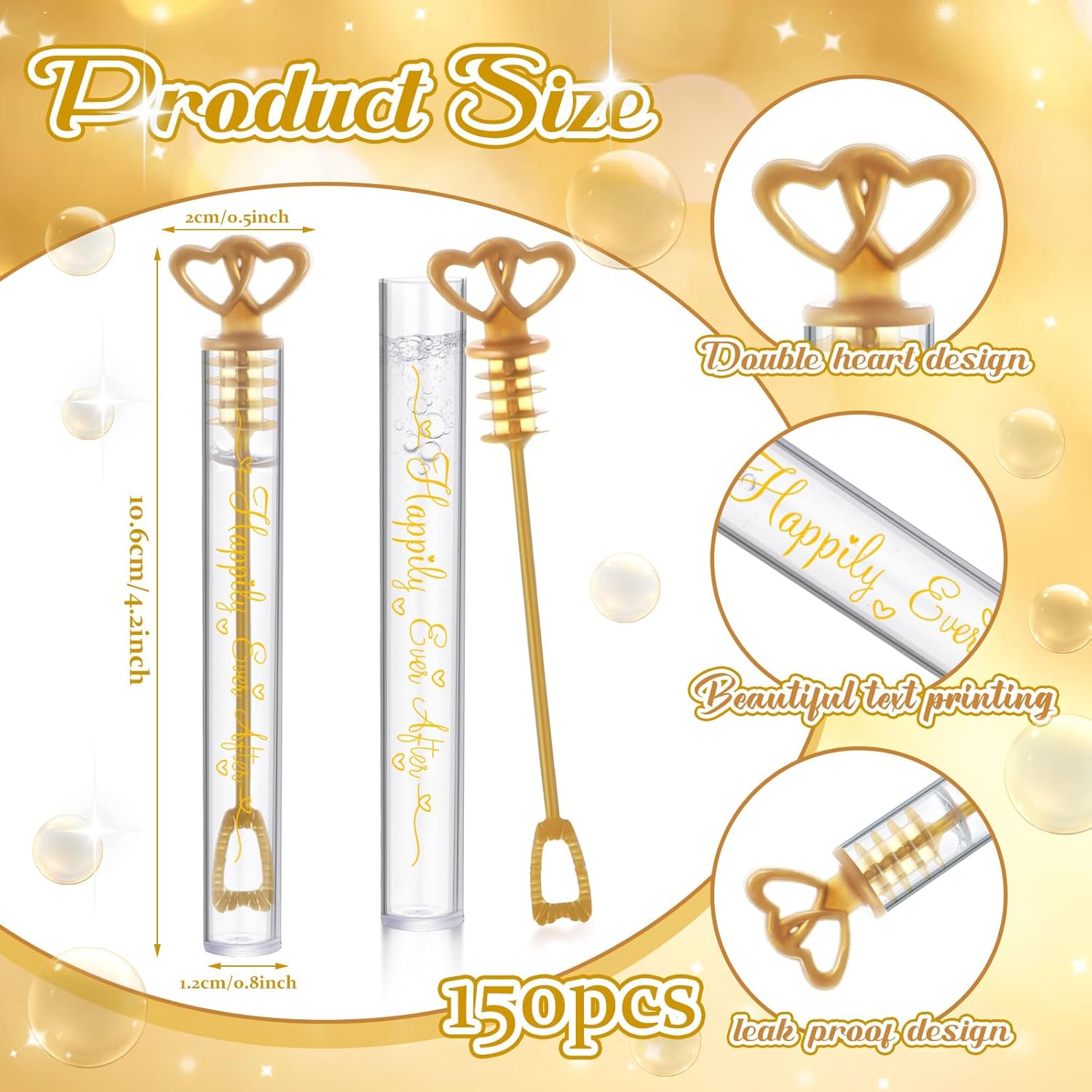 150 Pcs Bubble Wands Bulk for Wedding Party Mini Heart Wand with Bubble Solution for Wedding Bridal Showers Valentine Anniversary Graduation Birthday Supplies(Gold,Happy Ever After)