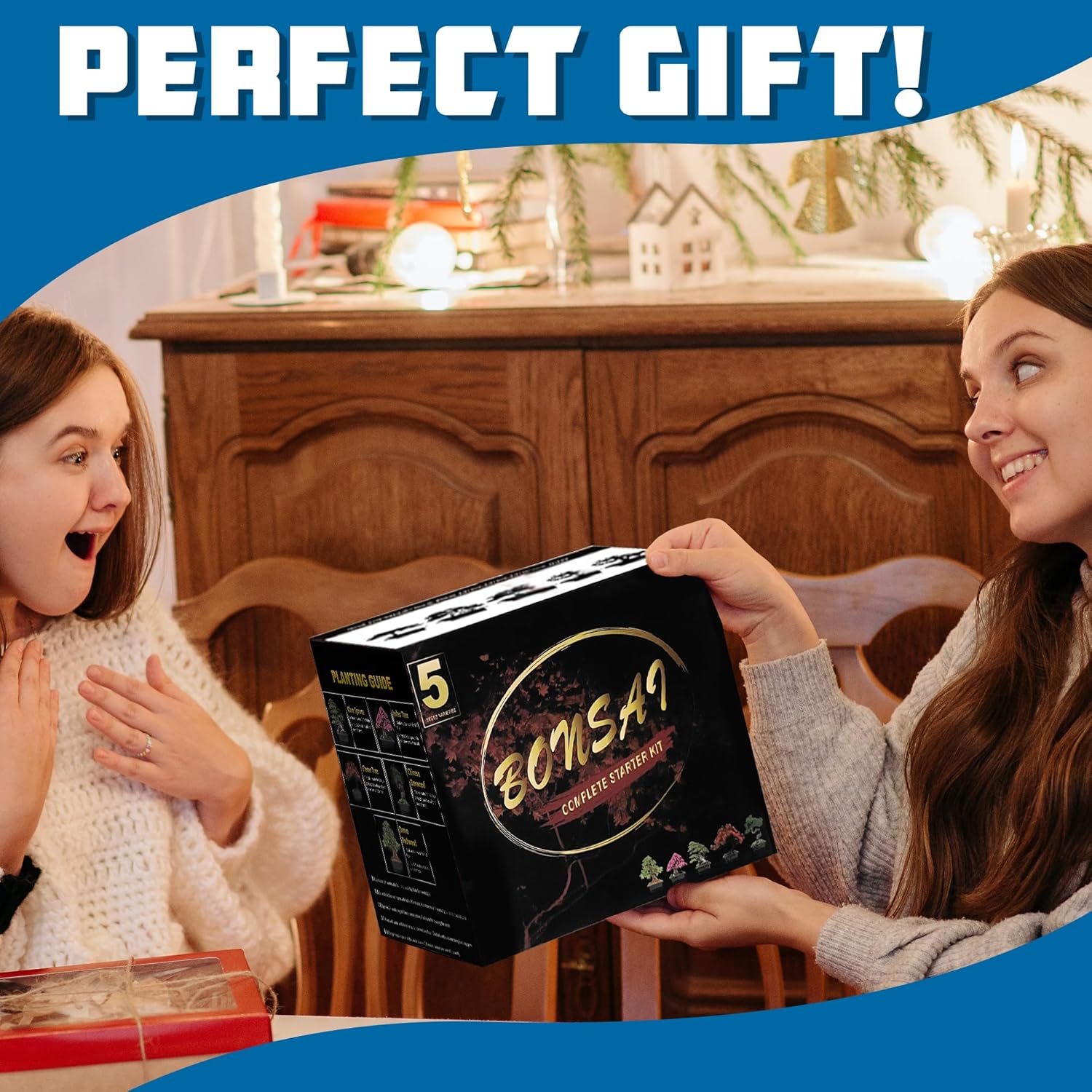 Bonsai Starter Kit, 5 Seeds Growing into Blue Spruce, Chinese Boxwood, Dawn Redwood, Flame Tree and Judas Tree, Including Complete Gardening Tools with A Gift Box, Christmas Gifts for Women