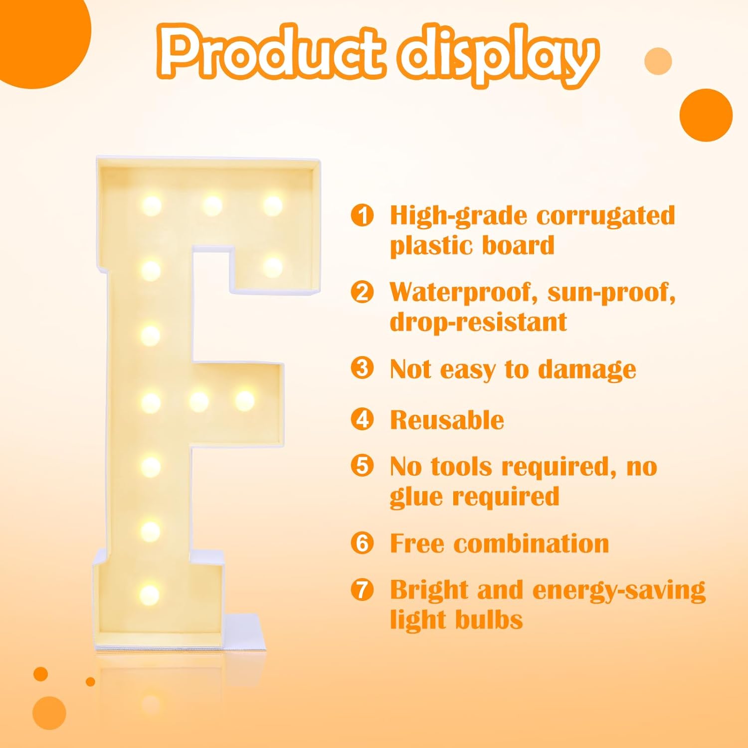 • Easy To Assemble Light Up Letters: Our unique 4ft marquee light up letters are not afraid of water and is not easily damaged. Pre-cut boards with clear markings help you set up your plastic marquee light up letters with minimal effort, and quickly without any tool. The combination of letter balloons and fake flowers will make the decoration full of vitality, romance, and joy, adding a sense of celebration to the party. (Note: balloons and fake flowers are not included, you need to prepare them yourself) Letter F