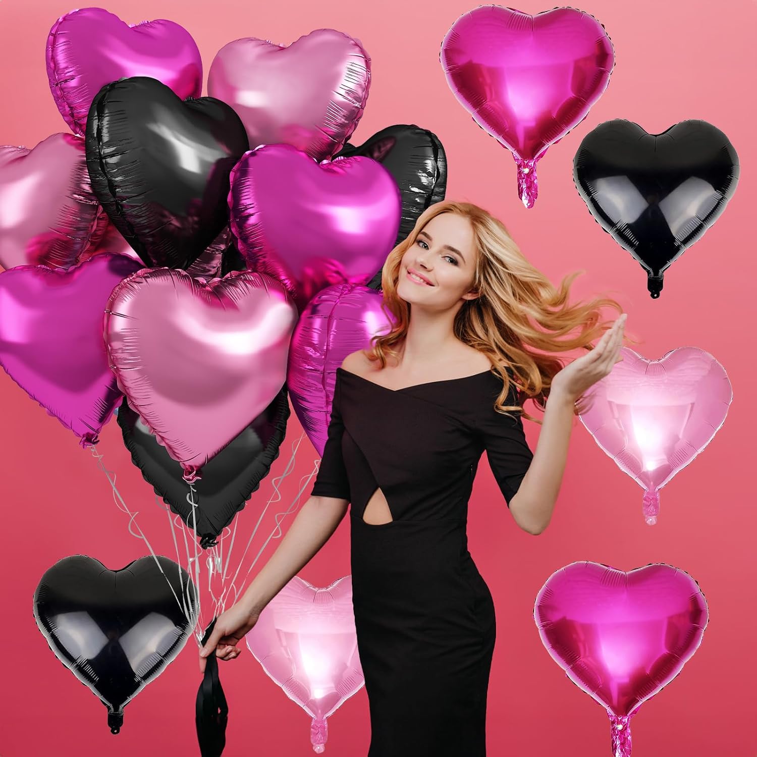 • Black Light Pink Heart Balloons: 12 Packs 18 inch foil balloons. Included 4pcs matte black foil balloons, 4pcs hot pink foil balloons, 4pcs baby pink foil balloons and 1pc ribbons. Hearts foil balloons are the optimal choice for any party occasion