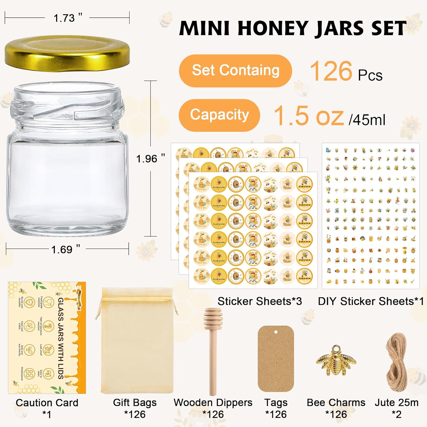 • 【Exquisite Small Honey Jars Set】Our mini jars of honey set includes 126 mini honey jars with dippers, lids, bee charms, gift bags, tags, stickers, and jute twine. The 1.5 oz glass honey jars with lids blend elegance and practicality, turning simple gestures into heartfelt treasures.
