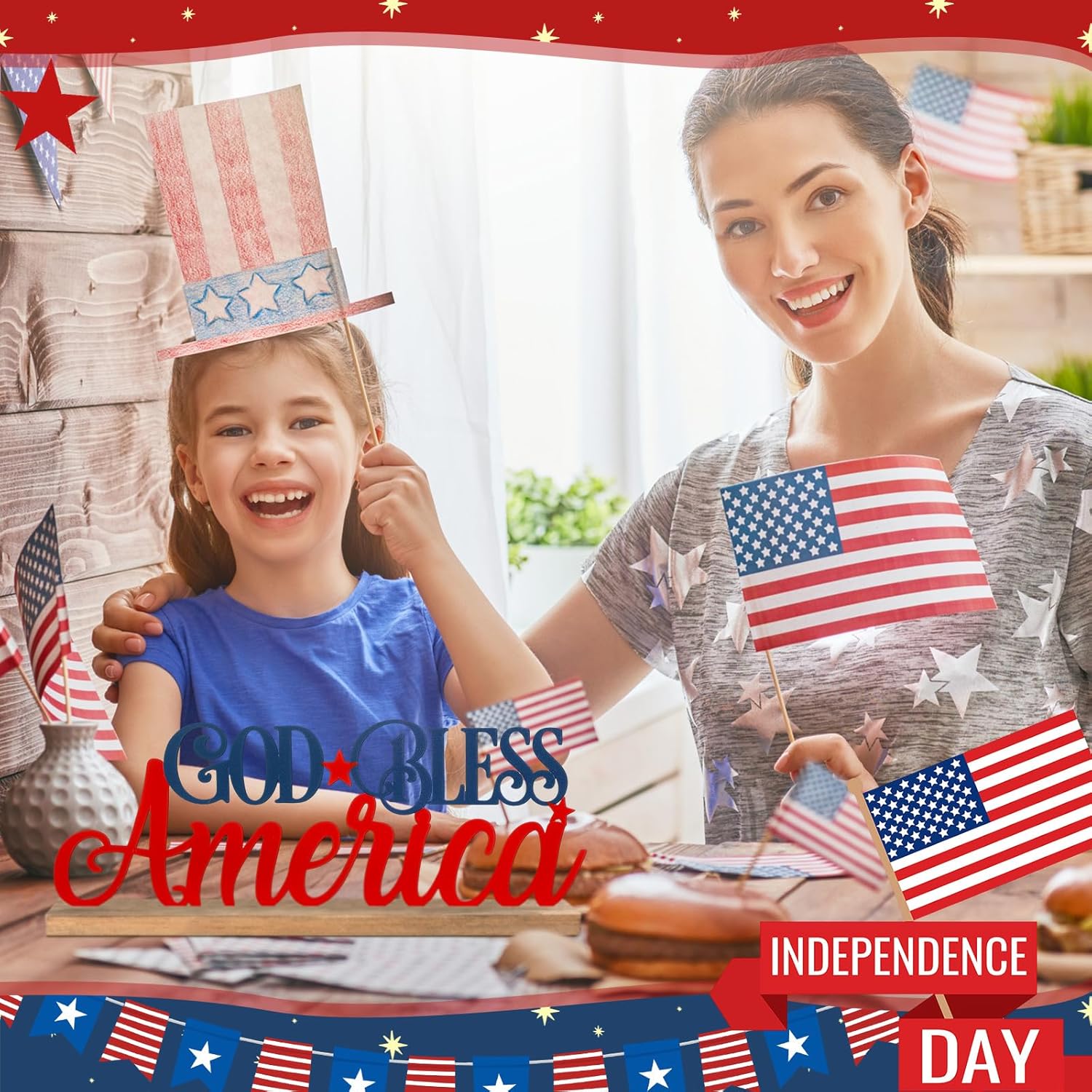 Patriotic God Bless America Metal Sign Rustic Table Decor Holiday Tiered Tray Decor with Wooden Base Freestanding Metal Word Sign for Home Tabletop Centerpiece Mantel Shelf Fireplace
