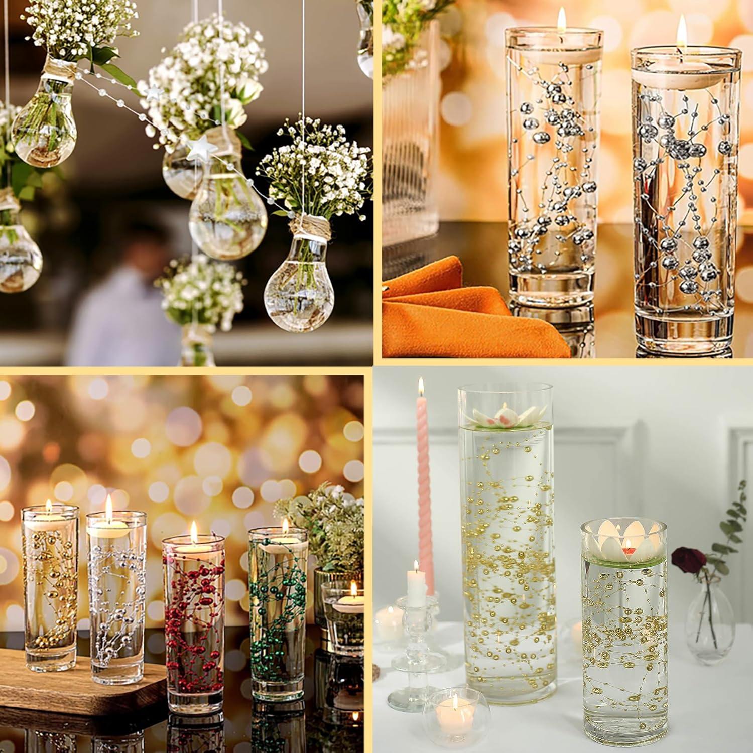 • Pearl String Beads: These artificial fake pearls strands are designed for floating candles, easy to use, just fill the string beads into the floating candle glass candle holders; you can also fill the vase with water and add 2 or 3 strands of beads string, which will make the centerpiece more romantic and gorgeous, for tall or large vases, just fill it with more strands of pearl decorations to bring a rich and luxurious look to your precious vase filler