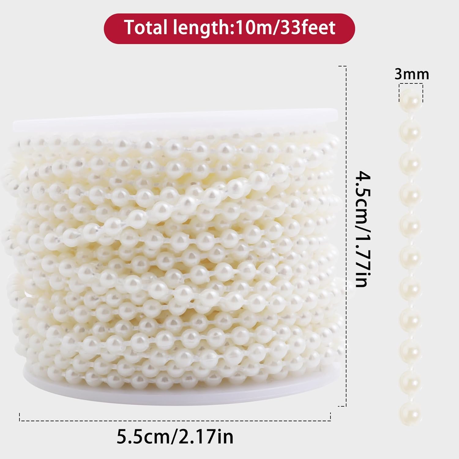 • Size: each roll of pearl chain has a total length of 33 feet/10 metres. The diameter of artificial pearls is 3mm. Please check the size before purchasing