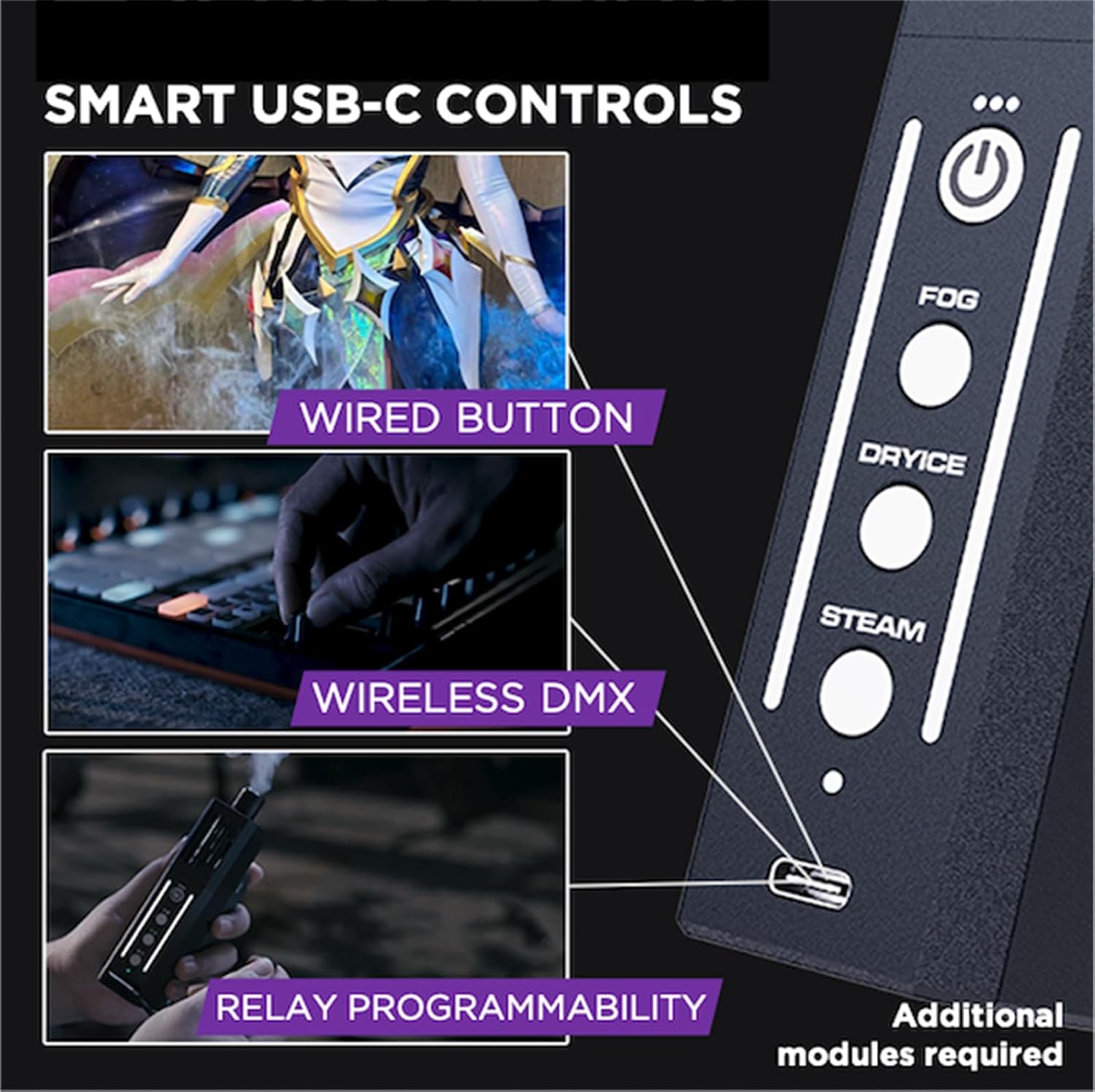 • USB-C CONTROL FOR CUSTOMIZATION: Features USB-C connectivity for precise control and compatibility with DMX and wired button modules (sold separately). Create tailored fog effects to match your creative vision.