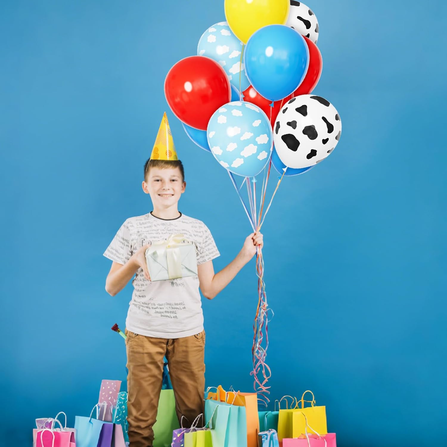 • 【Balloons Packing 】12 Inch balloons pack: Package includes 16 pcs light blue balloons, 16 pcs red balloons, 16 pcs yellow balloons,10 pcs cow balloons and 10 pcs could balloons with 2 ribbons.