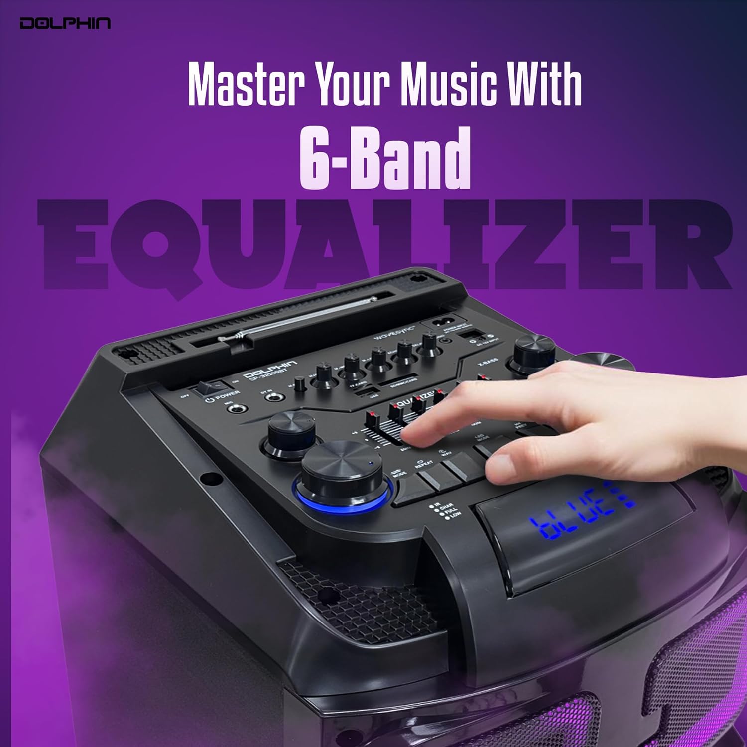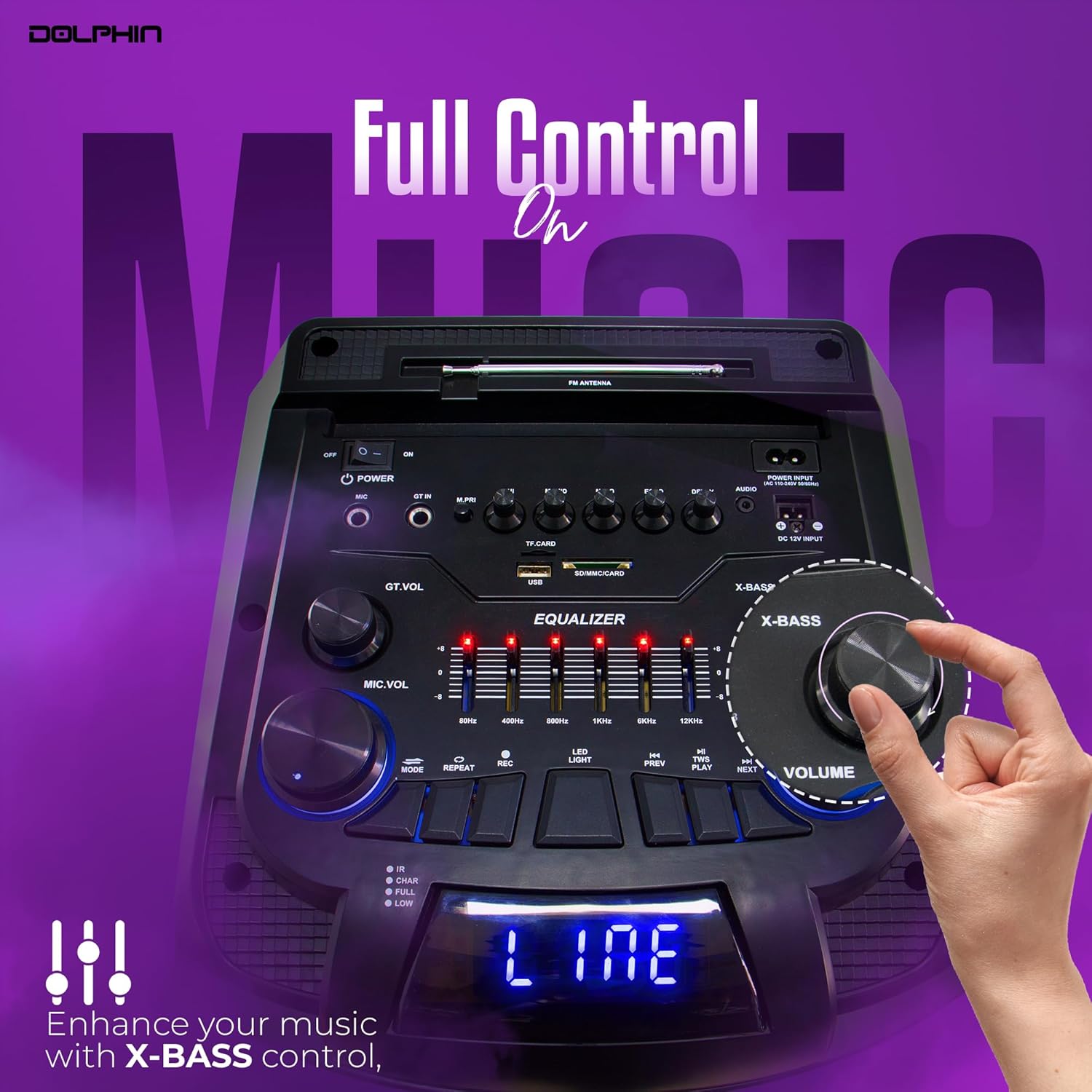 Dolphin High-Power Portable Party Bluetooth Speaker – Wooden Cabinet, X-BASS, LED Lights, Wireless Microphone – Ideal for Parties, Tailgating, and Events