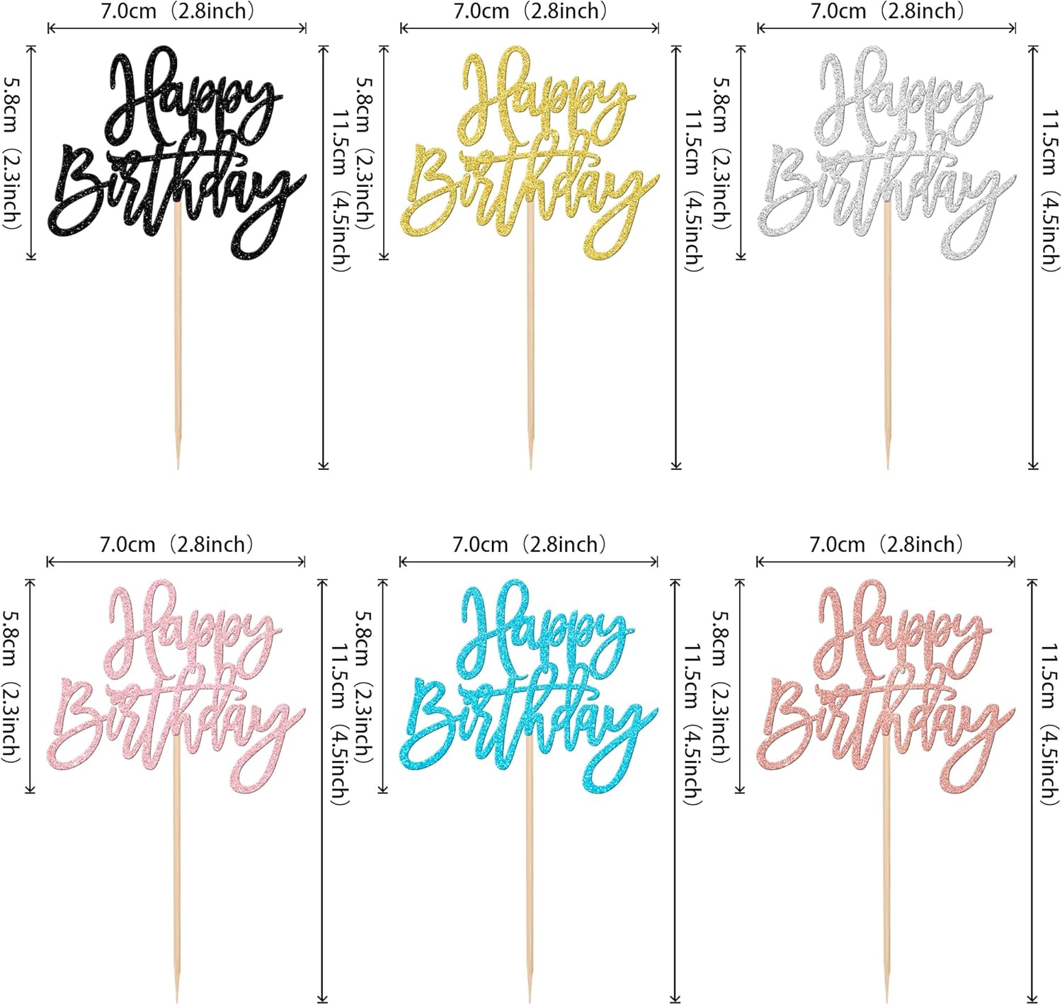 24 PCS Glitter Cupcake Toppers - Happy Birthday & Anniversary Picks - Multi 6 Colors