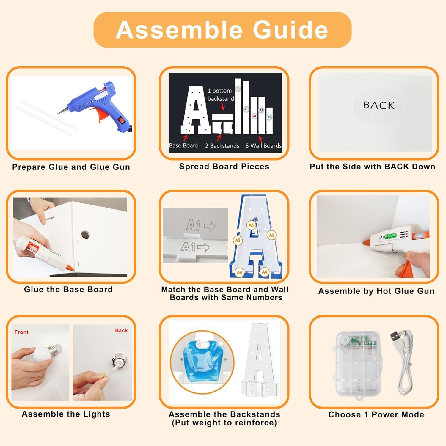 • Easy to Assemble: Pre-cut foam frame board numbers are easy to set up: 1) Glue the base board and match the base board and wall boards according to same number. 2) Glue the base board and wall boards together. 3) Screw the bulbs into the board, connect LED lights and power on. (Noted: Glue gun, glue and batteries are not included)