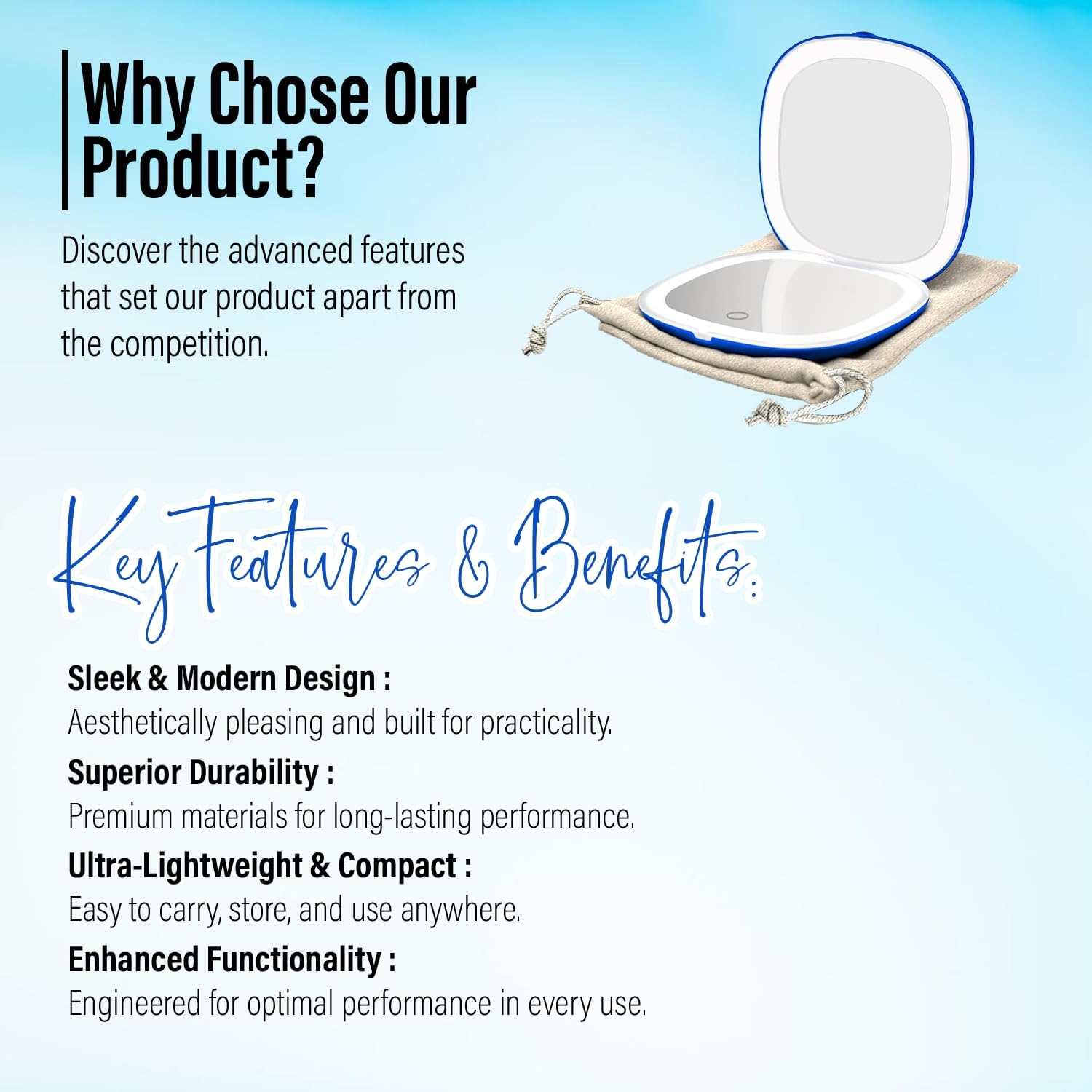 LED Compact Mirror – 1x & 10x Magnification | Travel Makeup Mirror with Adjustable Lighting | Handheld & Pocket-Sized Portable Mirror with Protective Pouch (Blue)