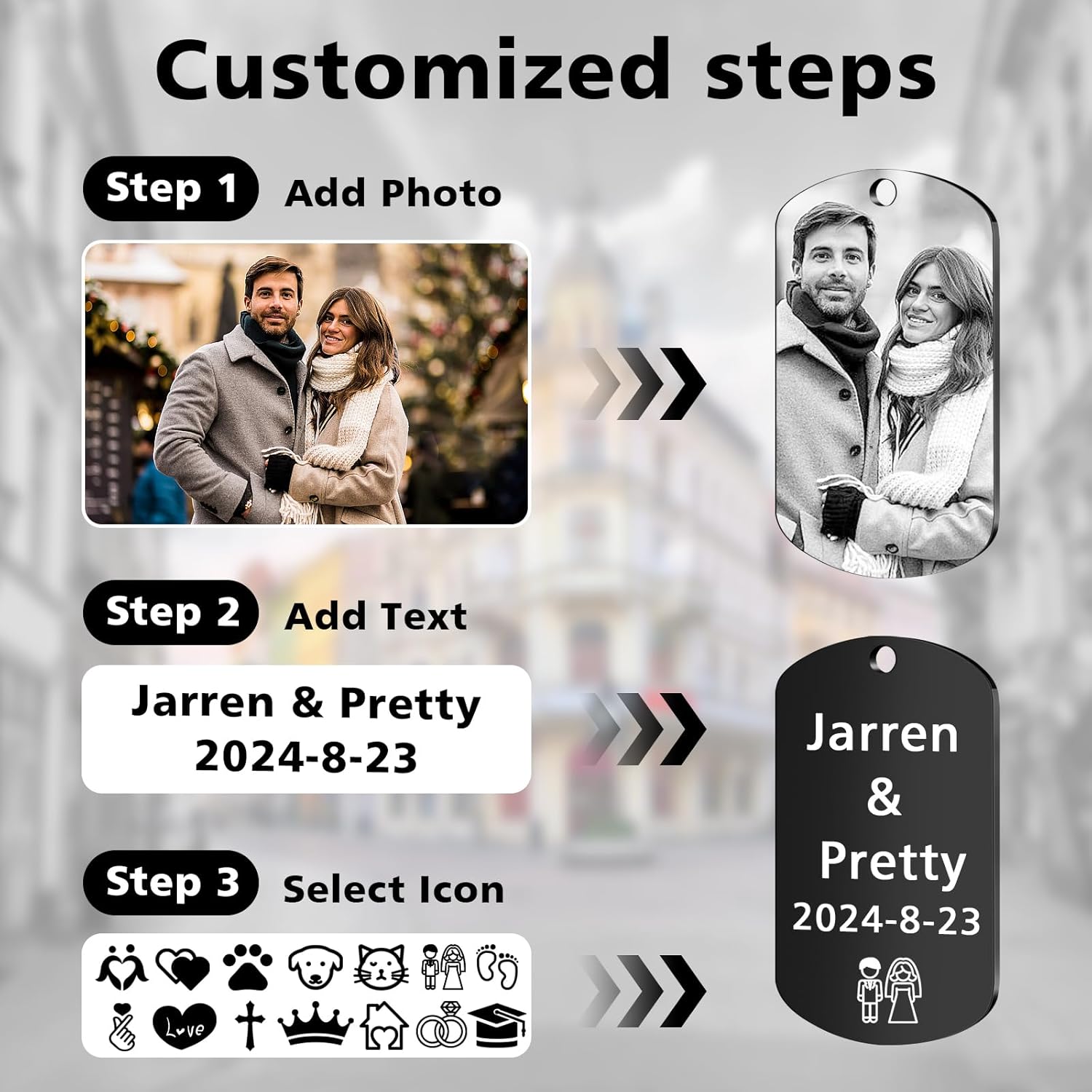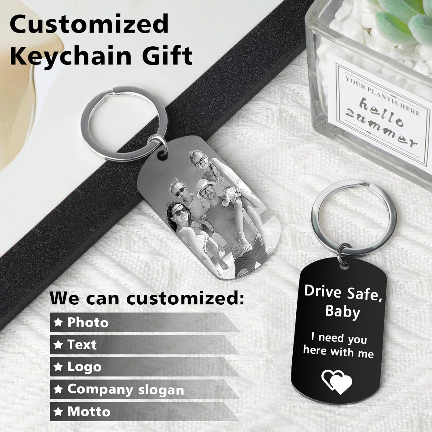 • How to Customize keychain ?-Simply click the “Customize Now” button to upload a high-resolution photo and input the customized text on the keychain . The custom keychain comes with gift box, symbolizing love, and is perfect gift for any special occasion—Christmas Day, Mother’s Day, Father’s Day, Valentine’s Day, weddings, anniversaries, birthdays, graduations,or any special occasion,simply a great