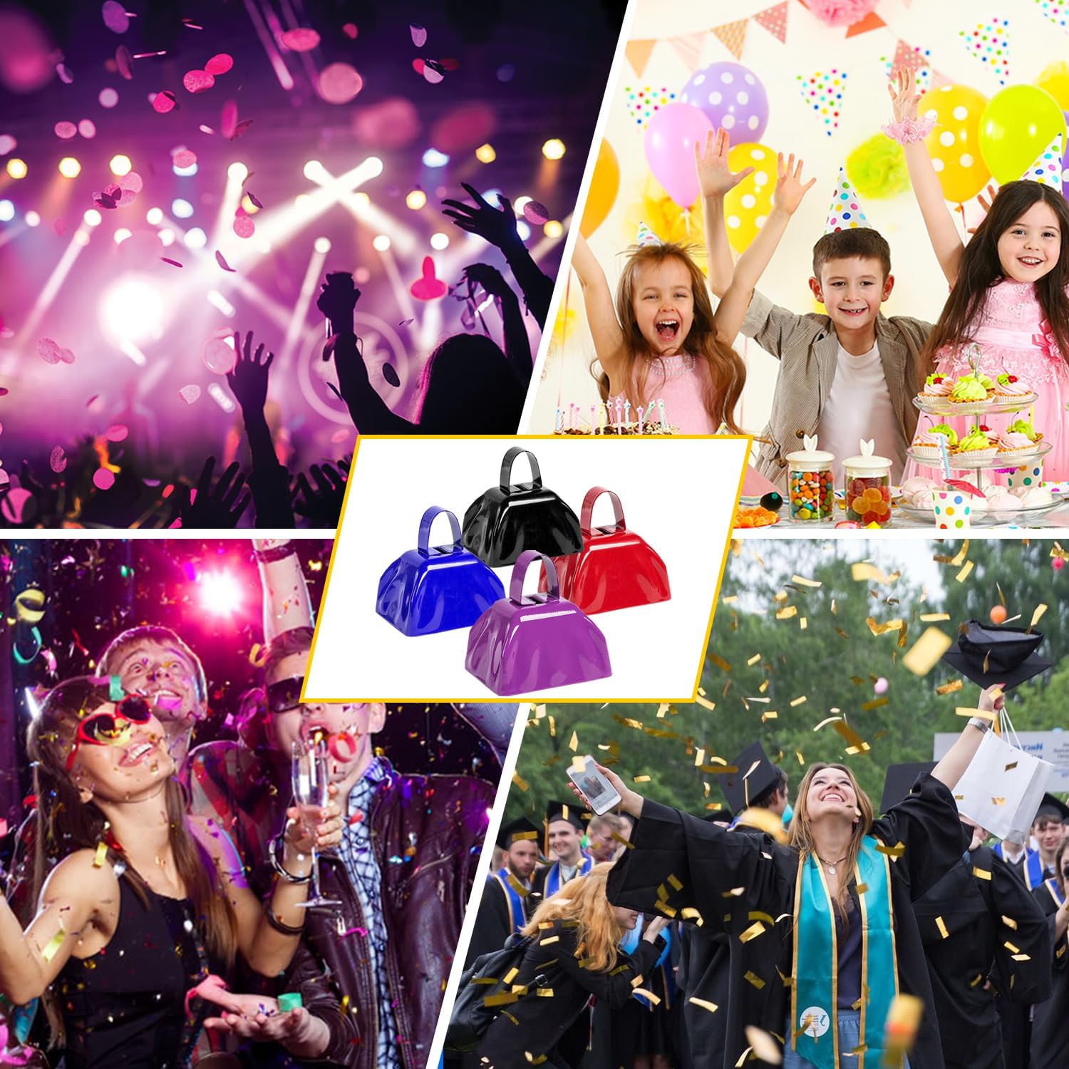 • PREMIUM QUALITY: Cheer on your team in style! This set includes four vibrant metal cowbells in blue, purple, black, and red. These sturdy, rust-resistant bells are built to withstand years of use at sporting events and celebrations.