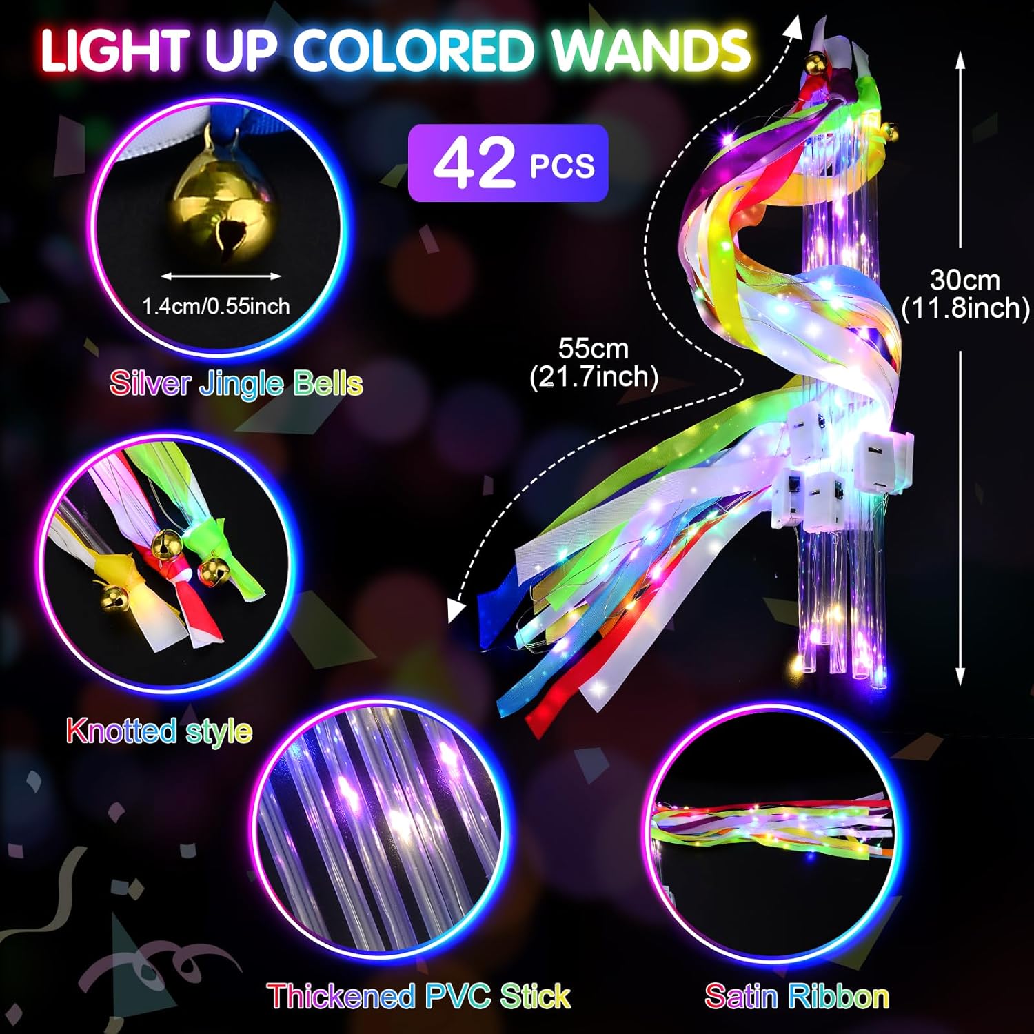 42 PCS Light Up Wands for Wedding, Wedding Favors with 3 Colorful Flashing Modes, LED Fairy Wands with Bells for Wedding Send Off, New Year, Raves, Concert, Birthday, Party Streamers