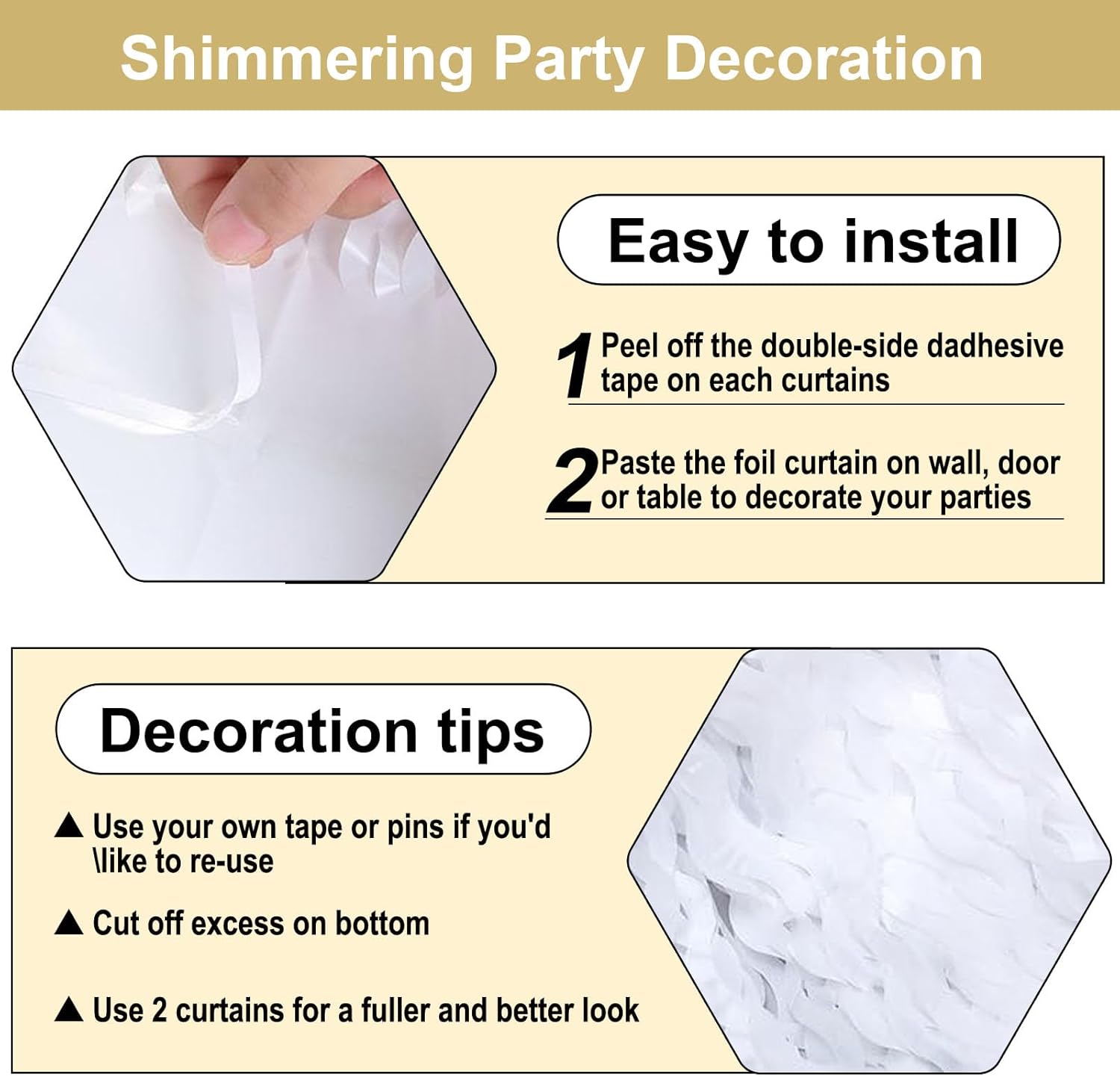 • Easy To Assemble | Strong Adhesive | Not Easy Fade : The foil fringe curtain backdrop party decorations come with double-sided adhesive tape, easy to use, just tear off the back of adhesive tape, then paste this streamers backdrop curtains on the top of wall, window, table, or as door fringe decoration.