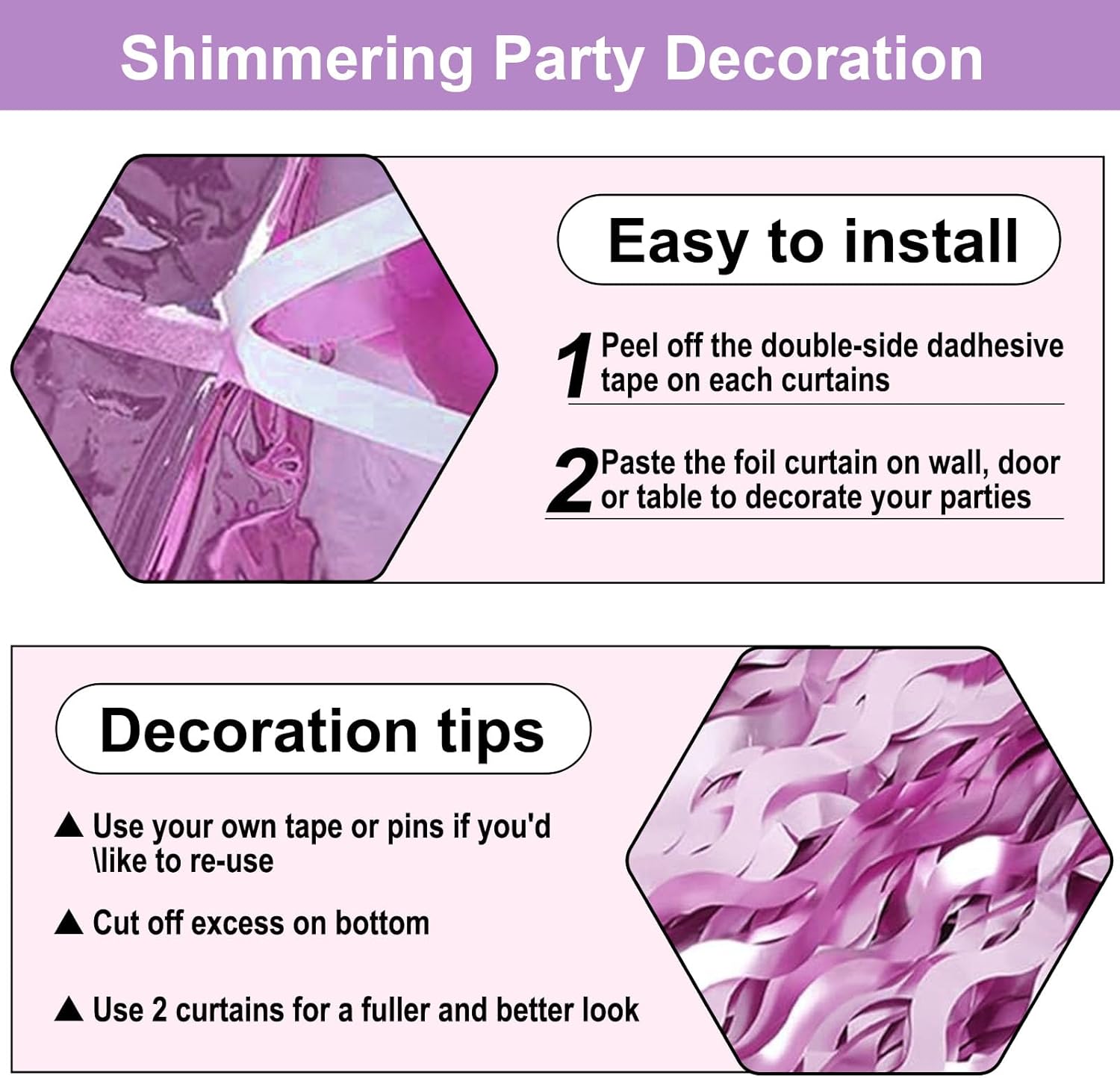 • Easy To Assemble | Strong Adhesive | Not Easy Fade : The foil fringe curtain backdrop party decorations come with double-sided adhesive tape, easy to use, just tear off the back of adhesive tape, then paste this streamers backdrop curtains on the top of wall, window, table, or as door fringe decoration.
