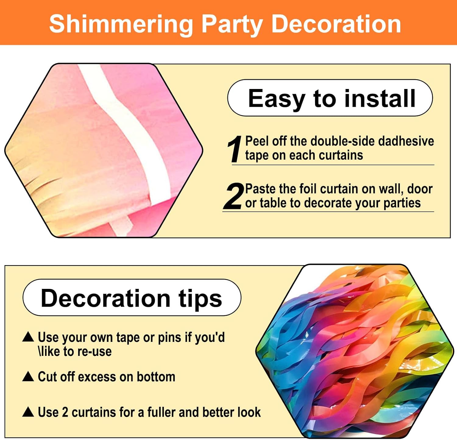 • Easy To Assemble | Strong Adhesive | Not Easy Fade : The foil fringe curtain backdrop party decorations come with double-sided adhesive tape, easy to use, just tear off the back of adhesive tape, then paste this streamers backdrop curtains on the top of wall, window, table, or as door fringe decoration.