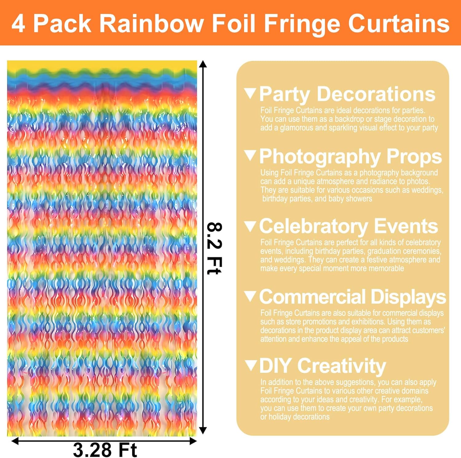 • Widely Applications:The foil fringe backdrop are wonderful finishing touch for any theme party such as birthday party, theme party, Halloween, Christmas, New Year Eve, bachelorette party, wedding, bridal shower, baby showers, graduations Etc.