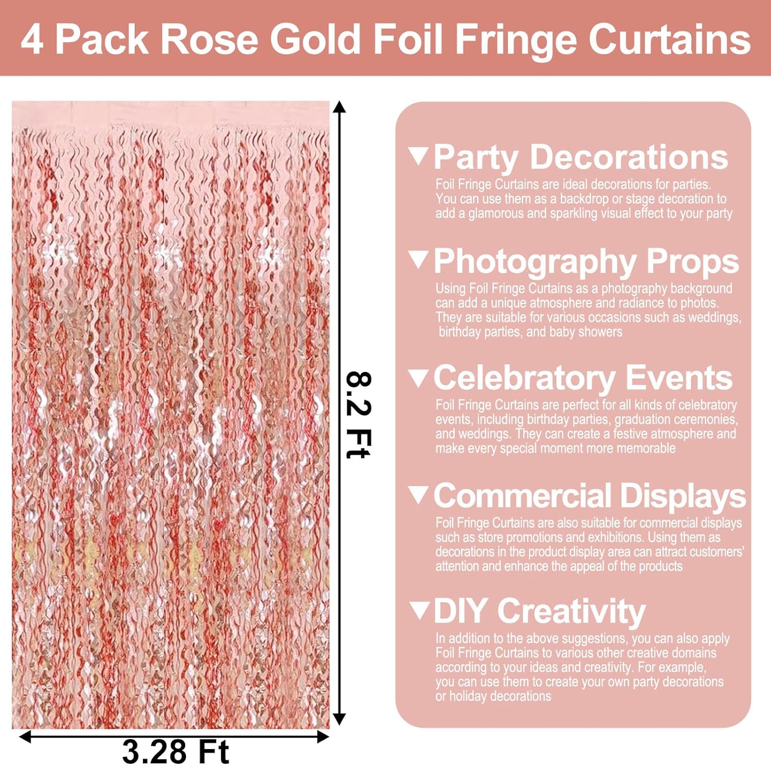 • Widely Applications:The foil fringe backdrop are wonderful finishing touch for any theme party such as birthday party, theme party, Halloween, Christmas, New Year Eve, bachelorette party, wedding, bridal shower, baby showers, graduations Etc.