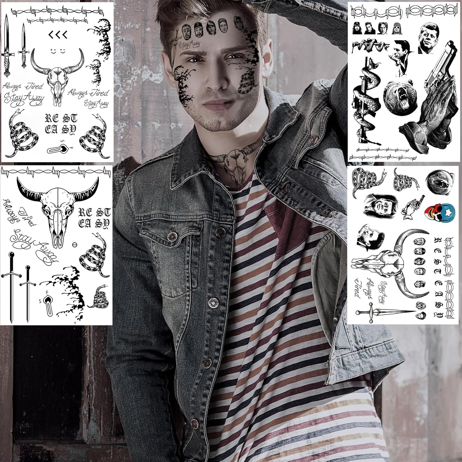 • 【MORE QUANTITY】Our Halloween face tattoos and fake tattoos set with 12 sheets, include 4 sheets cosplay rapper inspired temporary tattoos face tattoo set(size 21*15 cm/8.3*5.9 inch), 10 sheets Halloween temporary tattoos for cos play(size 10.5*6cm/4.1*2.4 inch). Face tattoos accommodate to different faces, enough to share with friends.