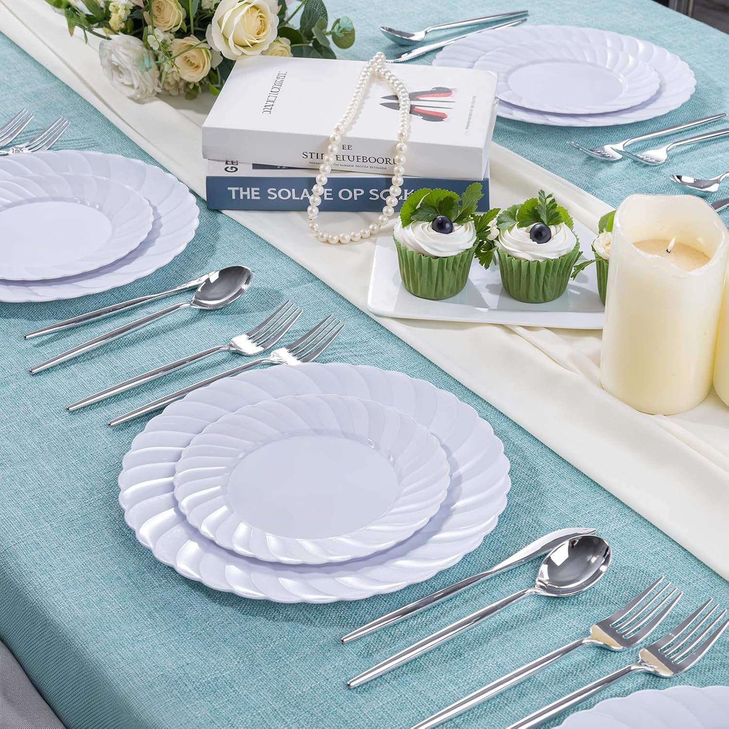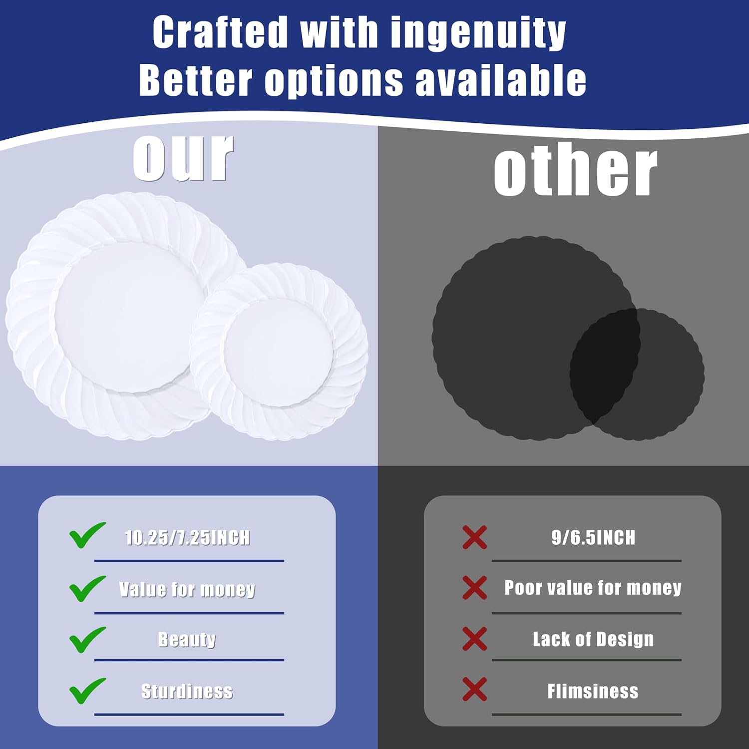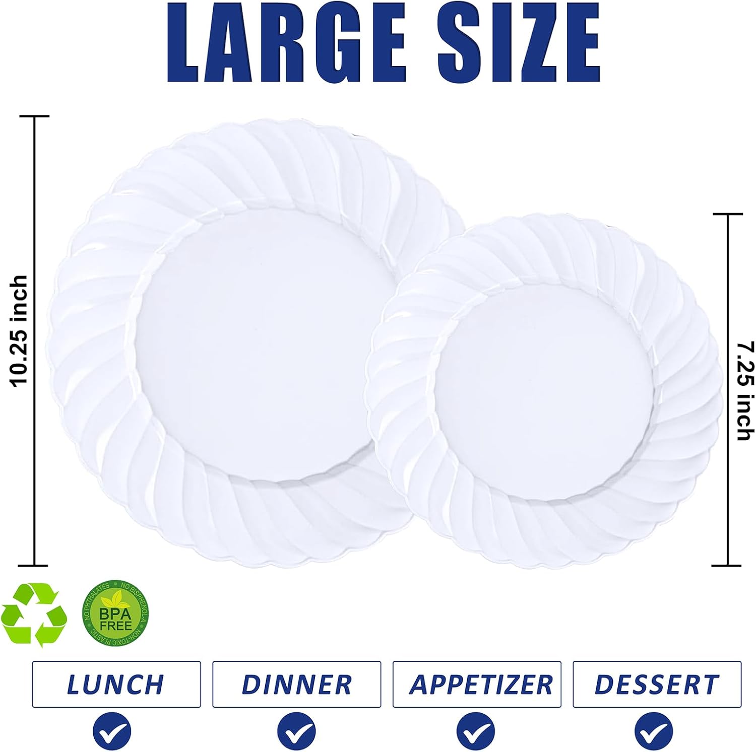U-QE 60 Pcs White Plastic Plates for Party – Scalloped Plastic Plates Heavy Duty & Elegant – Include 30 10.25" Dinner & 30 7.25" Dessert Plate - Perfect for Weddings, Bridal Showers and Parties