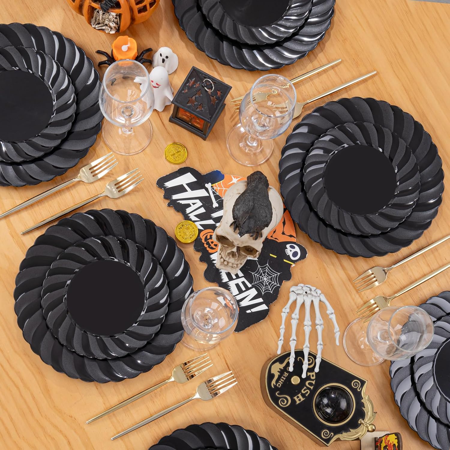 U-QE 60 Pcs Black Plastic Plates for Party – Scalloped Plastic Plates Heavy Duty – Include 30 10.25" Dinner & 30 7.25" Dessert Plate - Perfect for Halloween, Weddings & Birthdays