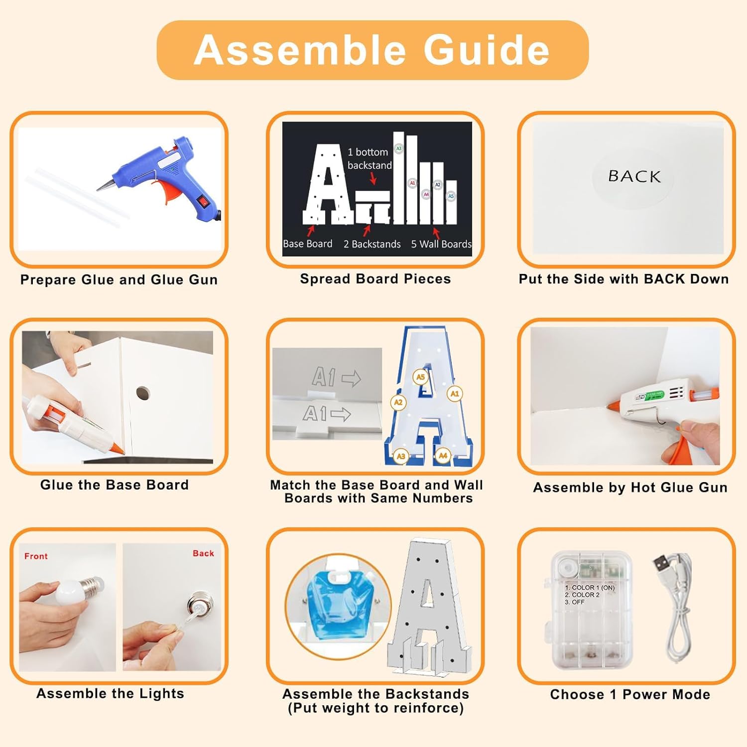 • Easy to Assemble: Pre-cut foam frame board letters are easy to set up: 1) Glue the base board and match the base board and wall boards according to same number. 2) Glue the base board and wall boards together. 3) Screw the bulbs into the board, connect LED lights and power on. (Noted: Glue gun, glue and batteries are not included)