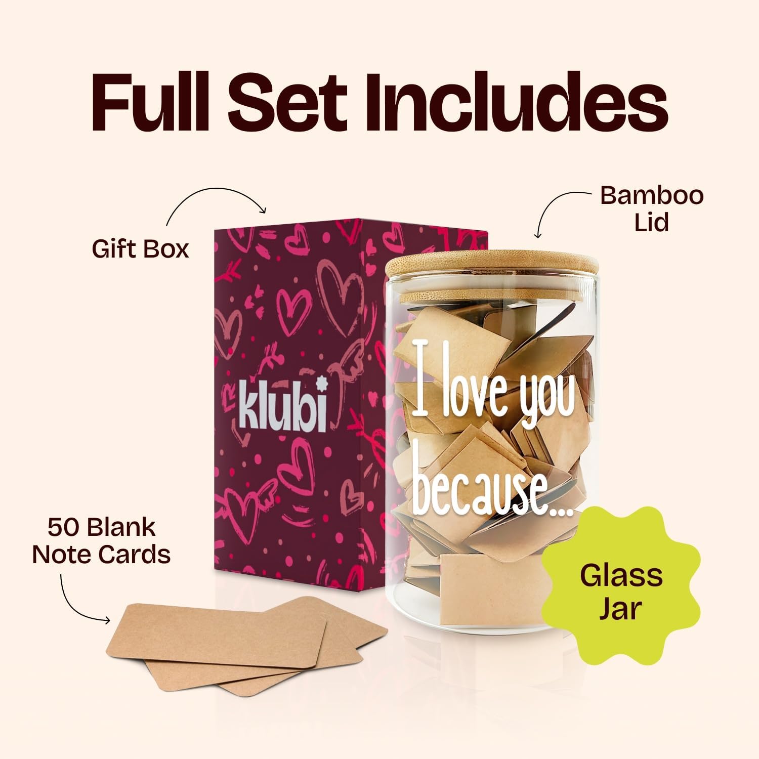 • A Thoughtful Way to Express Love โ€“ This love note jar includes 50 blank note cards, allowing you to write heartfelt messages, romantic confessions, or words of encouragement for your special someone. It comes beautifully packaged in a red giftable box, making it a meaningful and elegant present for any occasion - a Fathers Day Gift from Daughter or Wife, Mothers Day Gifts for Wife from Husband, Reasons Why I Love You Jar or Gratitude Jar.