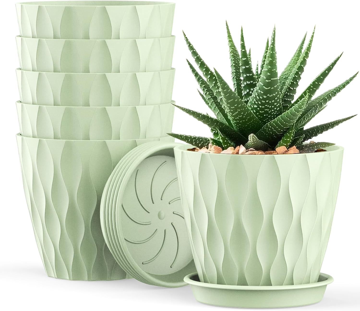4 Inch Small Pots for Plants, 6 Pack Waffle Texture Small Plant Pots for Succulents, Plastic Planter with Drainage Holes and Saucers for Indoor Outdoor Plants, Flowers, Herbs, Seedlings, Green