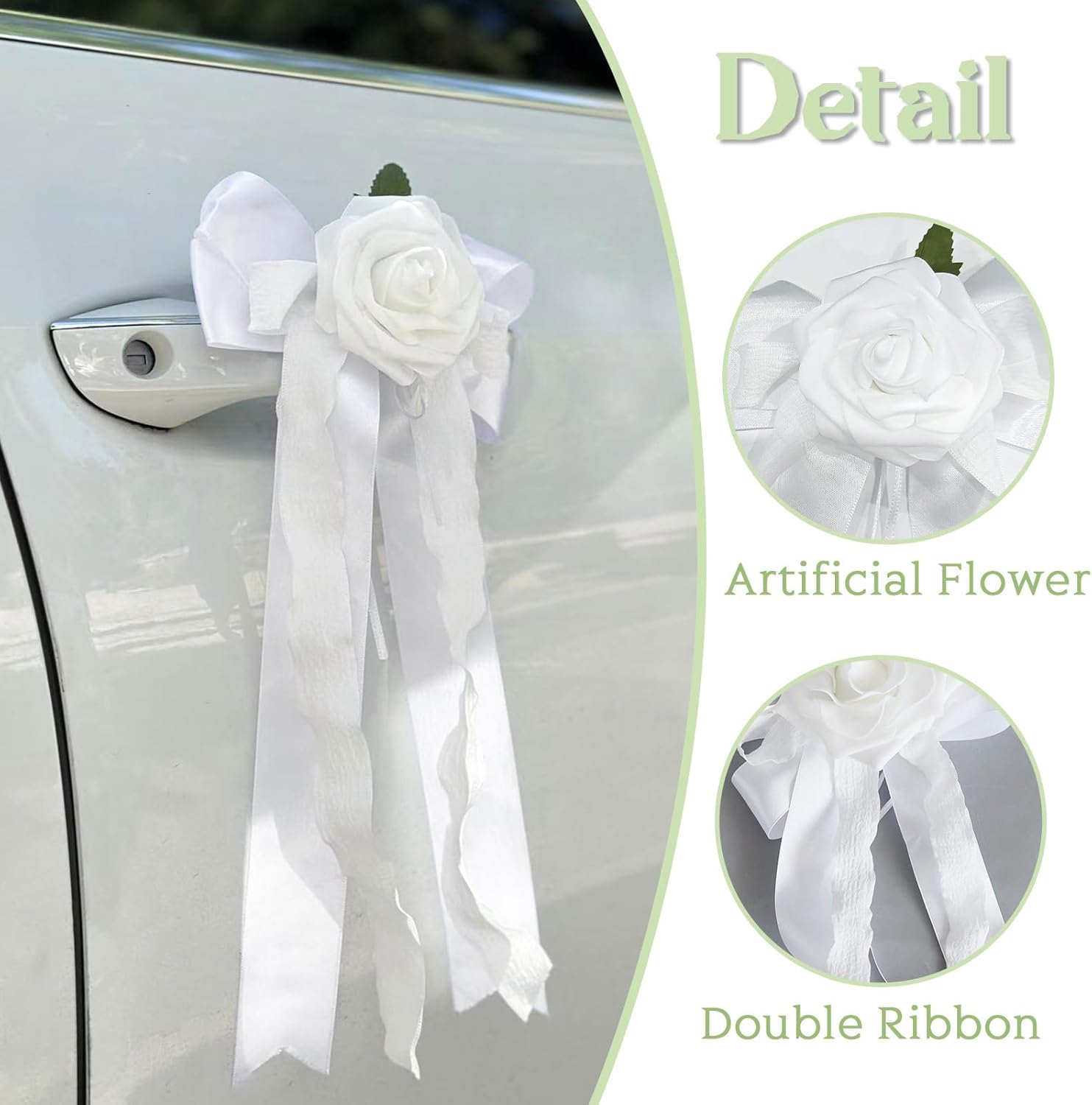 • Wedding Car Decoration Set: This set includes 6 decorative bouguet flowers car ribbon decorations, designed for car door handles and rearview mirrors. The mini bouguet flowers can your wedding car looks elegant and romantic from every angle