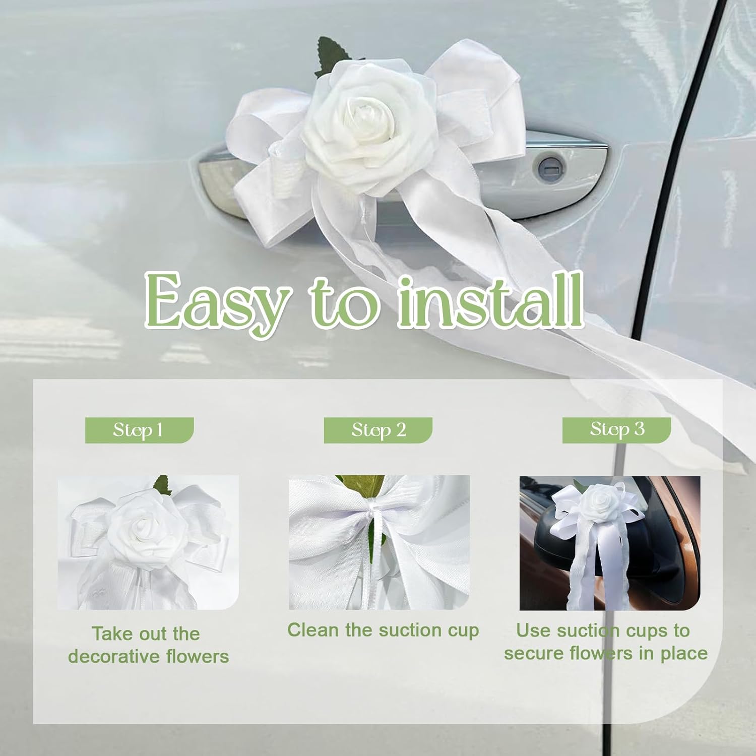 • Easy Installation: Featuring a convenient tie design, these decorations bouquet are simple to install without tools, ensuring a secure fit that won’t damage the car paint or mirrors