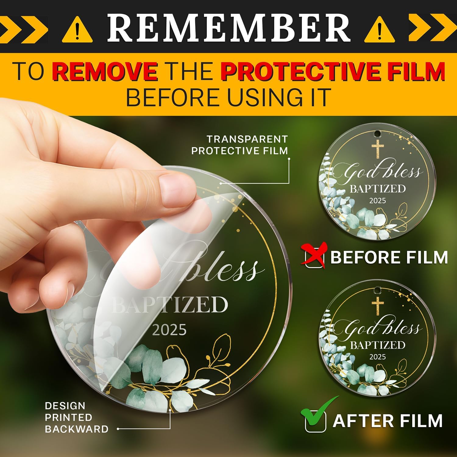 • ACRYLIC MATERIAL: Made from acrylic with a transparent protective film on the front to prevent scratches. The design is printed on the back, and to fully appreciate the ornament's beauty, remove the protective film to reveal the clear acrylic finish