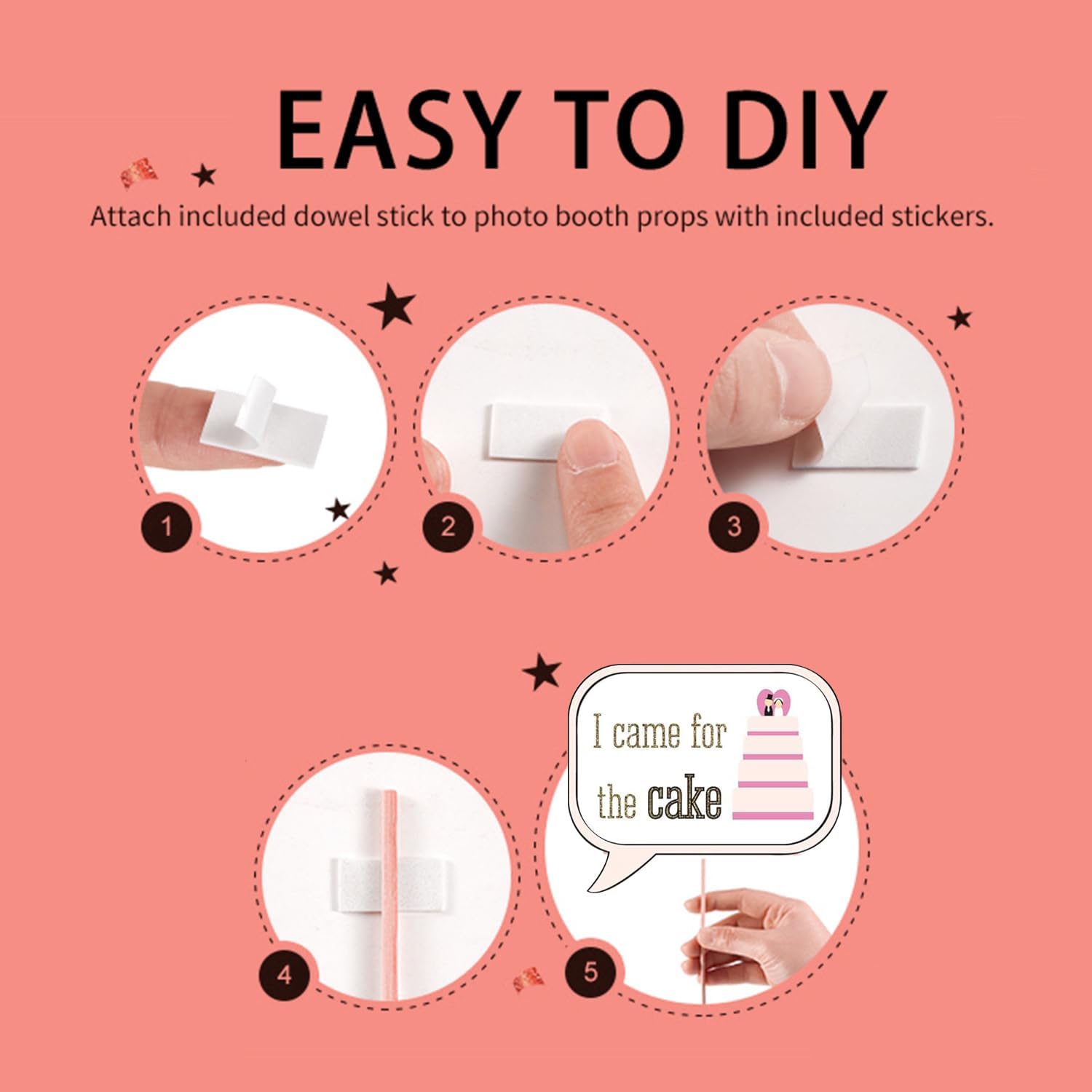 • Easy Assembly and Use: The sticks were easy to attach with the double sided thick sticky dots which come with the kit Simply paste the provided clear sticker on the bamboo stick, and attach it to every piece of card with the bamboo stick, then you can hold the wedding photo props in front of your face or over your head to take a lot of funny pictures