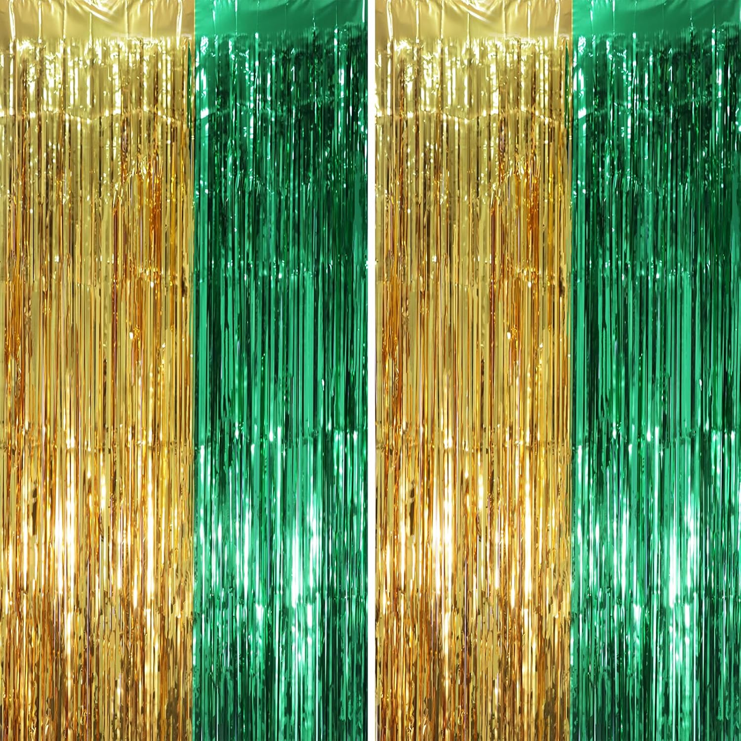 • Stunning Decorative Set: You'll receive 2 pcs gold green foil fringe backdrop curtains, each measuring 3.28 ft (wide)Γ—6.56 ft (drop). Enough length foil fringe curtains backdrops are perfect for the door or wall to create an impressive decoration