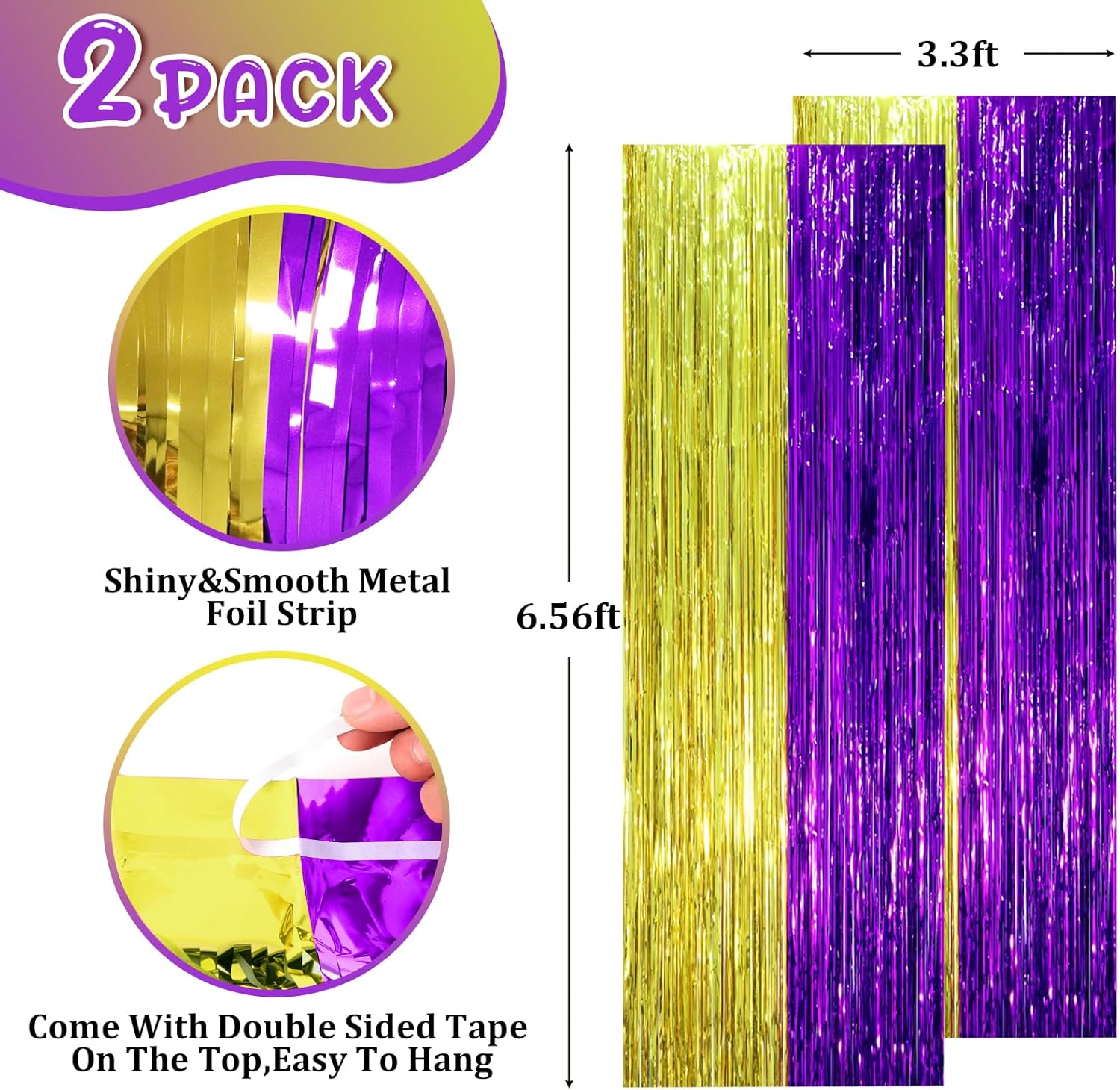 • Stunning Decorative Set: You'll receive 2 pcs purple gold foil fringe backdrop curtains, each measuring 3.28 ft (wide)Γ—6.56 ft (drop). Enough length foil fringe curtains backdrops are perfect for the door or wall to create an impressive decoration