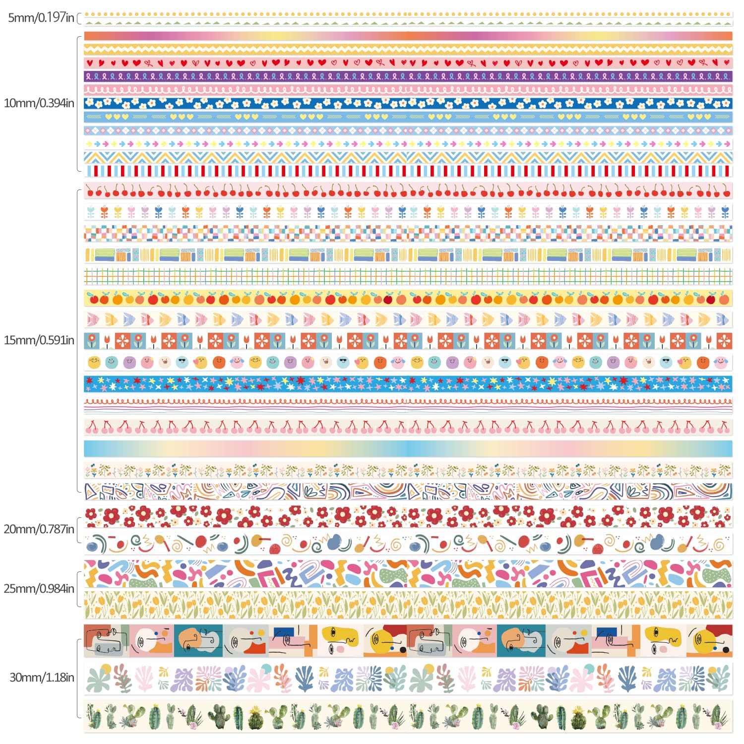 • 35 Rolls Washi Tape,1.18 inch (30mm) wide x 3 tapes; 0.98 inch (25mm) wide x 2 tape; 0.79 inch (20mm) wide x 2 tape; 0.59 inch (15mm) wide x 15 tapes; 0.39 inch (10mm) wide x 11 tapes; 0.19 inch (5mm) wide x2 tapes. These different series and sufficient quantity washi paper stickers can meet your use and replacement.