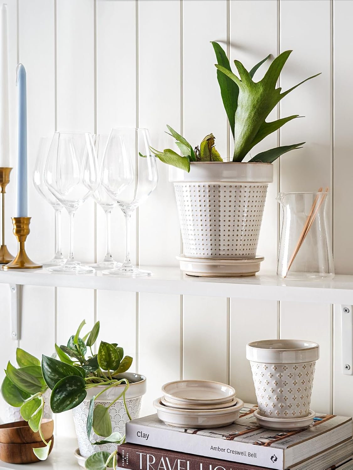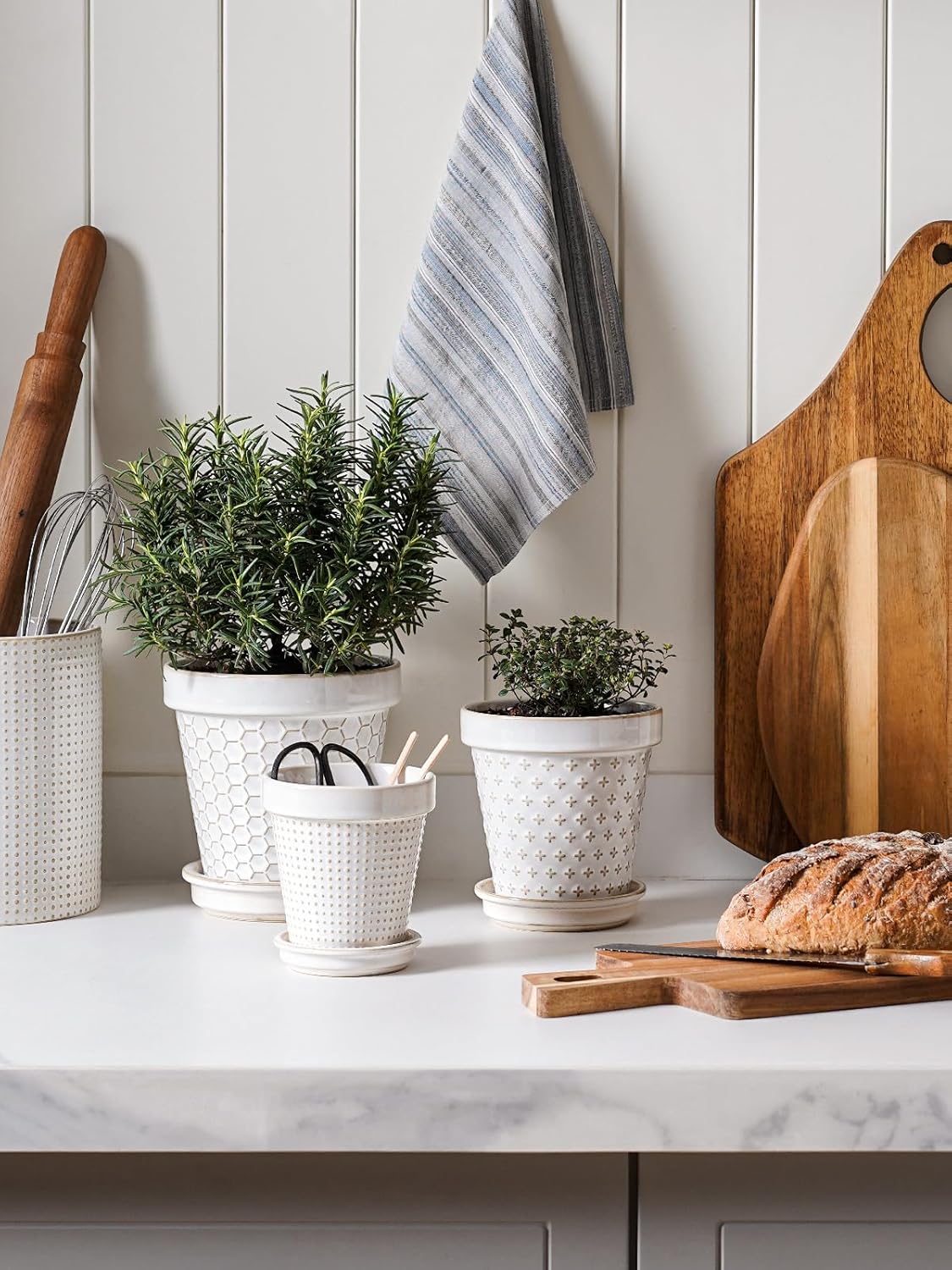 • Elegant Embossed Design: Featuring a unique relief pattern on each pot, this set adds a touch of artistry to any room. The arctic white glaze paired with a light brown pattern creates a timeless, elegant look that beautifully complements the green of your plants, enhancing your living space, bookshelf, or office desk