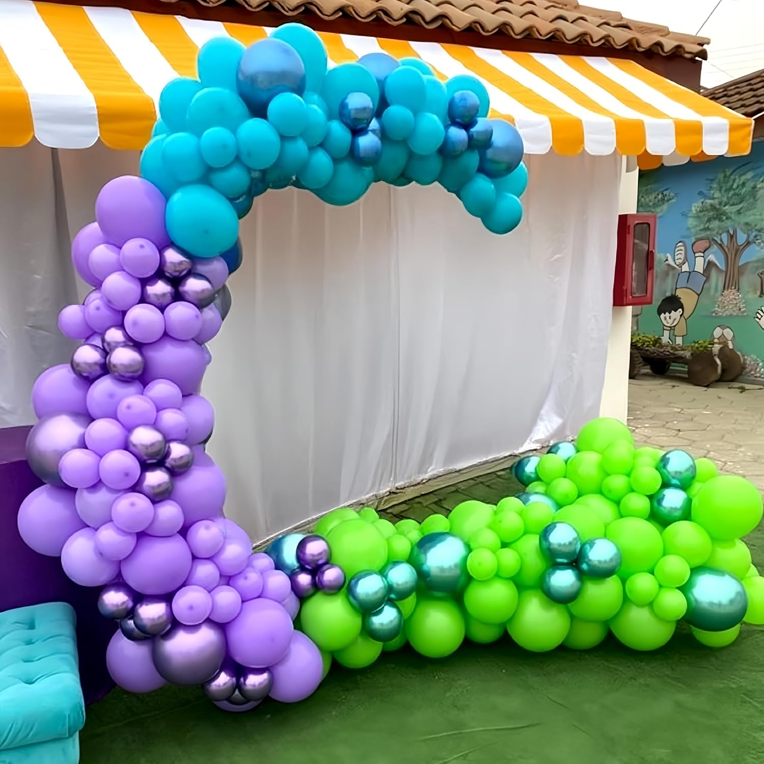 • Party Balloons Set: The purple pink balloons kit have 60pcs 12inch helium balloons, include 10pcs purple balloons, 10pcs pastel pink balloons, 12pcs teal balloons, 13pcs neon green balloons, 7pcs chrome purple balloons, 8pcs clear ballons, 2pcs balloon ribbon (purple, bright green).
