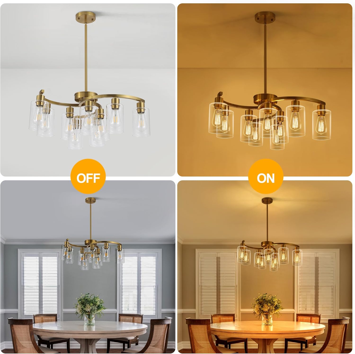 • [Modern Style]: Gold chandelier light fixture has 3 arms that radiate outward from the central arc, presenting a simple but not simple beauty. The body of the modern farmhouse chandelier is made of high quality metal with a fine polished surface and brushed. The clear glass shade not only ensures the soft scattering of light, but also complements the cold and hard texture of the metal, making the whole gold hanging light fixture both powerful and delicate. The downward-facing glass shade does not easily accumulate dust and is easy to clean.