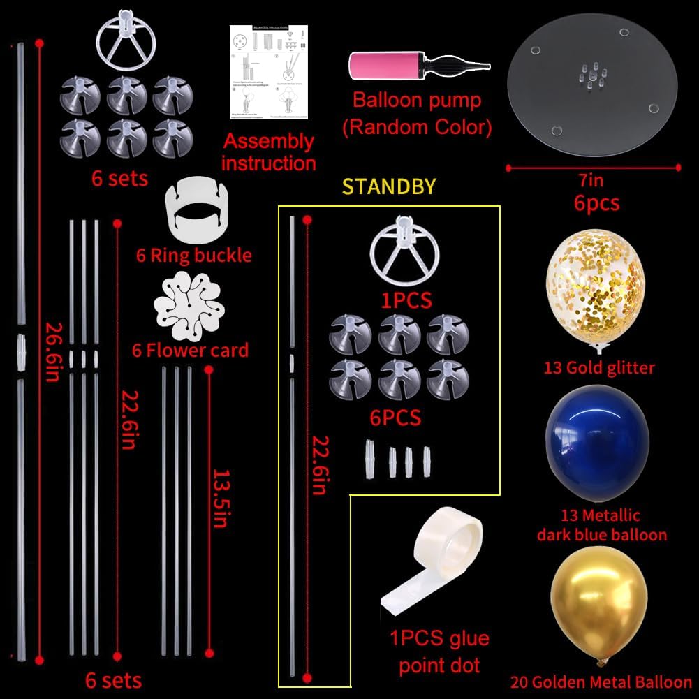 • Package Includes: The balloon stand kit includes 6 reusable balloon centerpiece table decorations and 12 inch 48pcs Latex Balloons(21 gold balloons,15 navy blue balloons,12 gold confetti balloonsοΌ‰,glue point dots,balloon pump,balloon clips,and tie tool.You don’t need to waste money to buy balloons